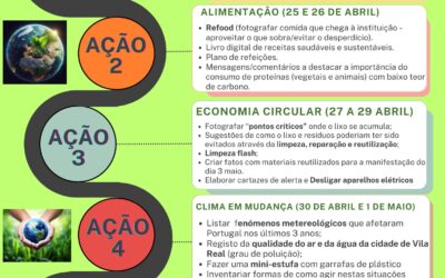 Ação 1 (22, 23 e 24 de abril) – Bioeconomia Relembrar/Partilhar o dia 21 de março, Dia Mundial da Floresta e da Poesia Fotografar produtos FSC (sacos de lã, panos alimentos biológicos… Fotografar sinalização solar e complementar à convencional (formas alternativas ao consumo de energia elétrica) Hor …