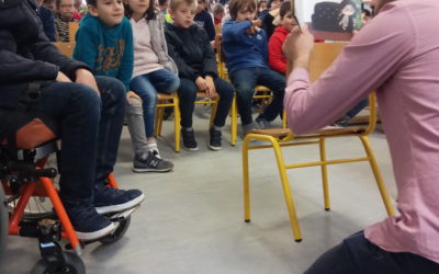 Alunos de duas Escolas do 1º Ciclo do Agrupamento de Escolas Trigal Santa Maria assistiram e interagiram com o contador de histórias durante a apresentação do livro “Pai Natal Verde” da empresa betweien.