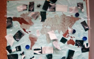 Os alunos fizeram um planisfério cujo oceano em vez de ser de água é de plástico