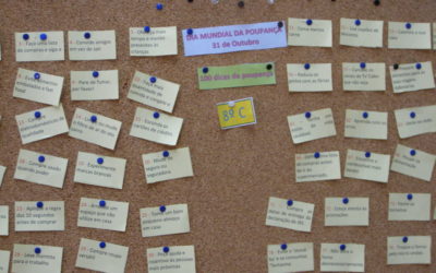 Os alunos do 8º C da Escola EB 2,3 Frei Estêvão Martins de Alcobaça no âmbito da comemoração do Dia Mundial da poupança publicaram num placard da escola 100 dicas de poupança em áreas tão diversas como água, energia, transportes, alimentação e hábitos de vida.