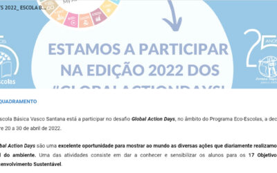 Ao longo da semana foi enviado um link para os trinta e sete Diretores de Turma da Escola Básica Vasco Santana, referente ao site subordinado aos 17 Objetivos de Desenvolvimento Sustentável (ODS), dinamizado pelo Programa Eco-Escolas, no âmbito do desafio Global Actions Days. Esta divulgação teve c …