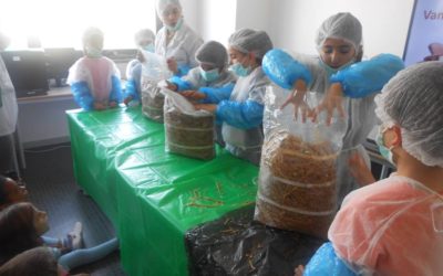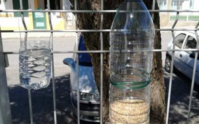 Os alunos usaram garrafas, arame, canas e colheres de pau para construírem os comedouros e bebedouros. Depois colocou-s …