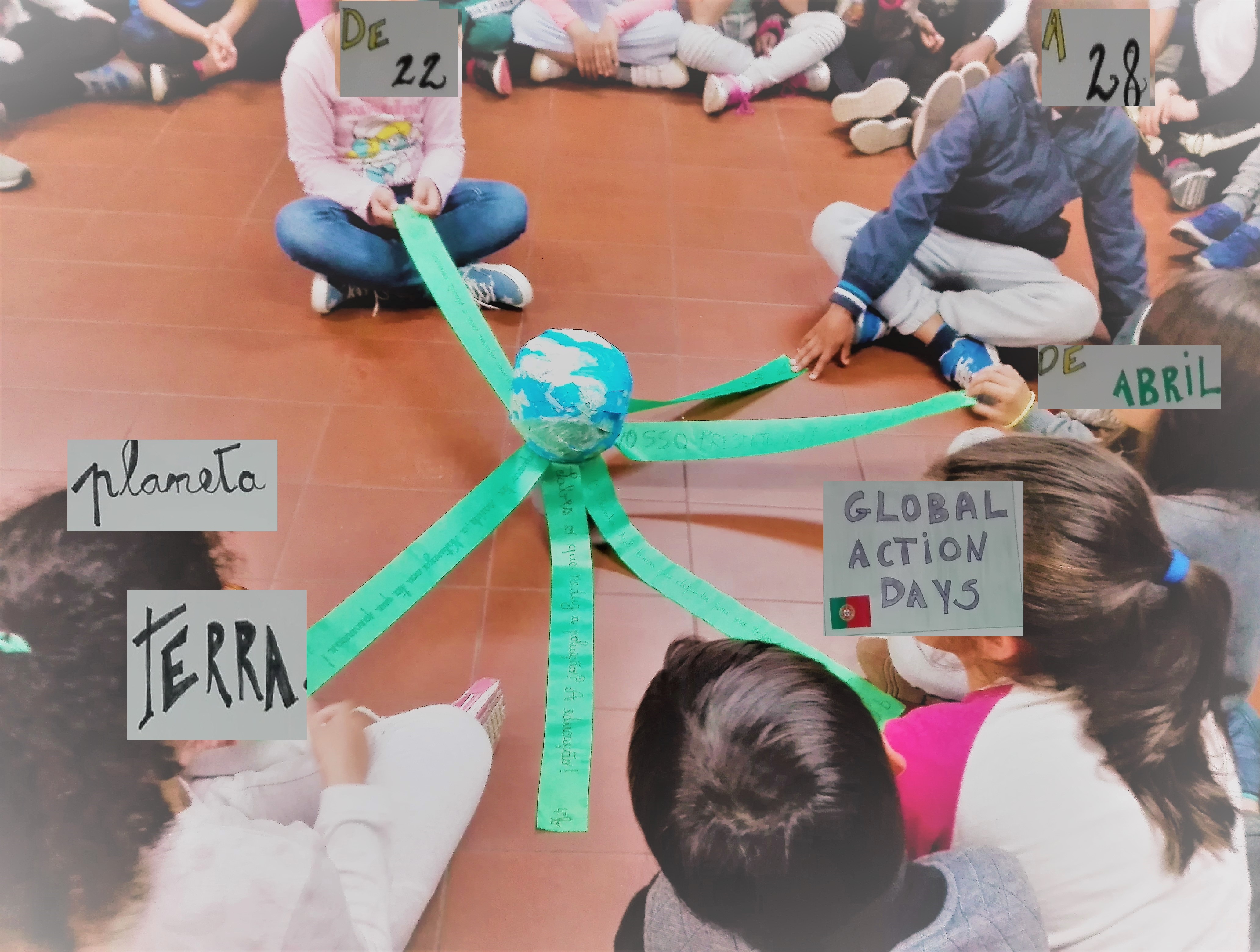3º) Por último, as professoras reuniram os seus alunos no patamar do corredor, sentados em círculo, à volta de um globo terrestre, construído em materiais reciclados. Um aluno por turma, lia a sua frase e colocava-a no globo terrestre. Por fim, a professora coordenadora leu o “ABC da natureza”. Foi muito interessante!