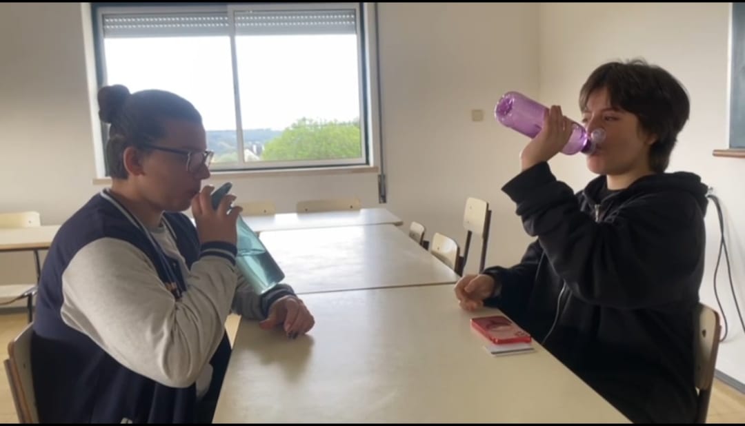Todos os dia continuamos a descartar garrafas de água. A Loren e a Iara do 9.ºB, mostraram ao colega Rodrigo que há opções como o cantil.