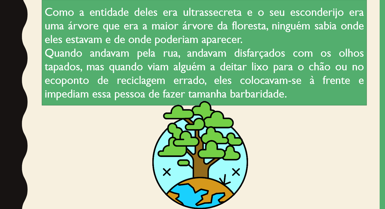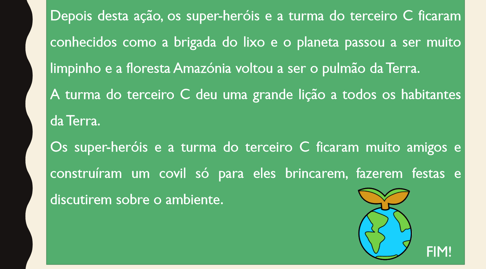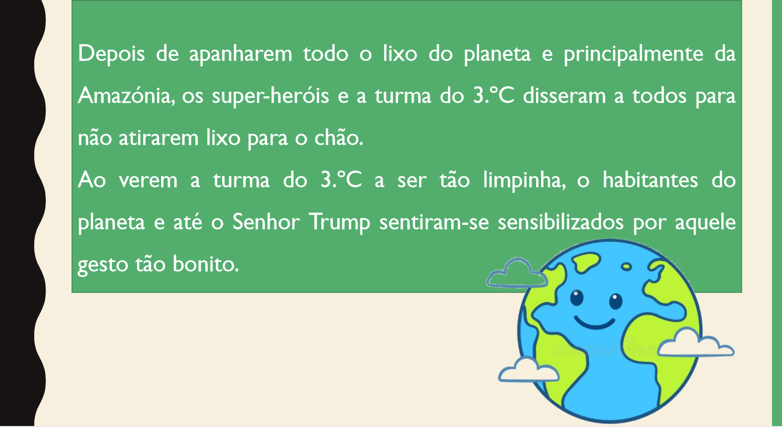 O ponto de partida da história era o tema ambiente. Depois, todos os alunos foram dando ideias e construímos a história apresentada. Até o presidente Trump entrou na nossa história 😉