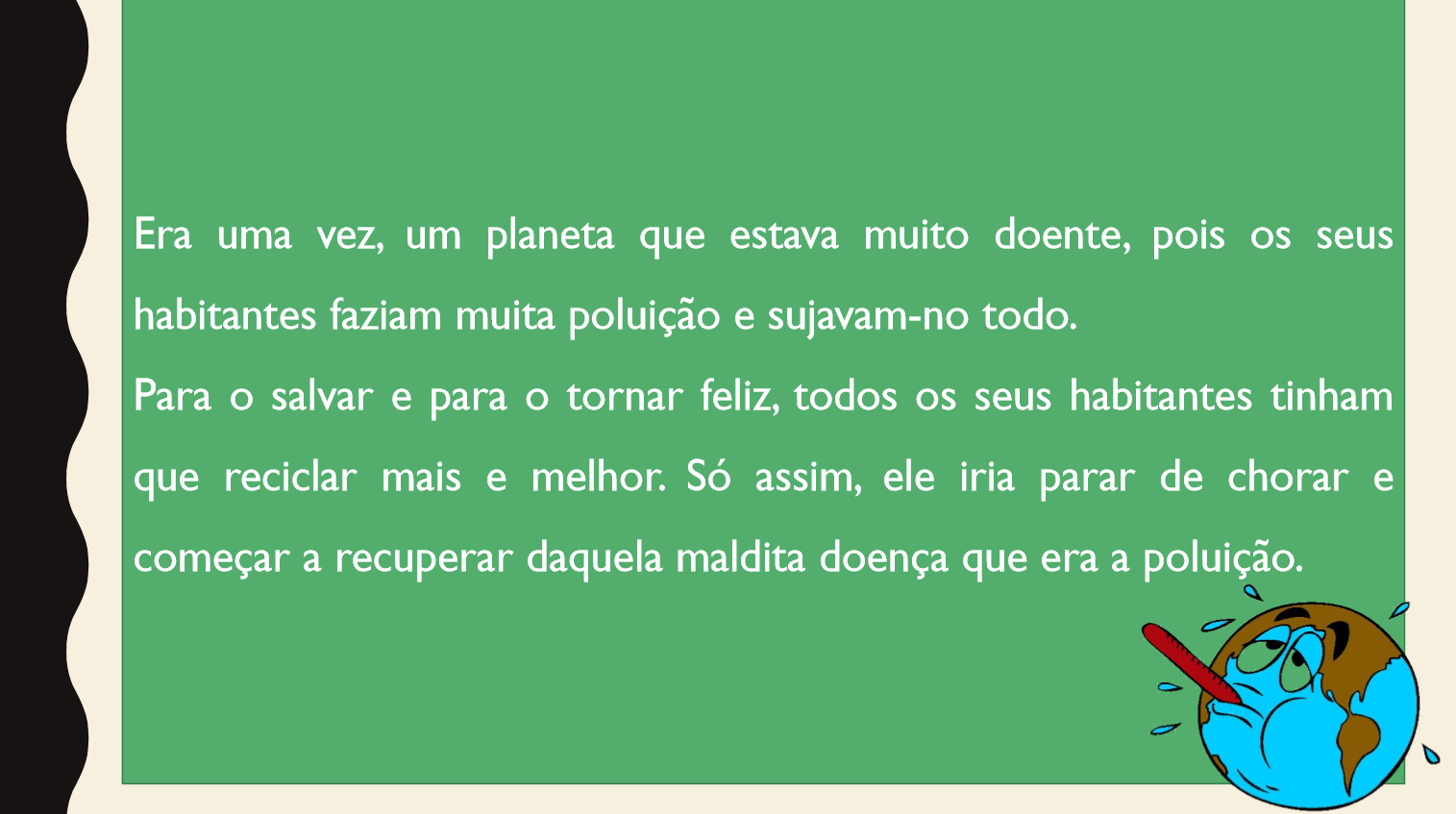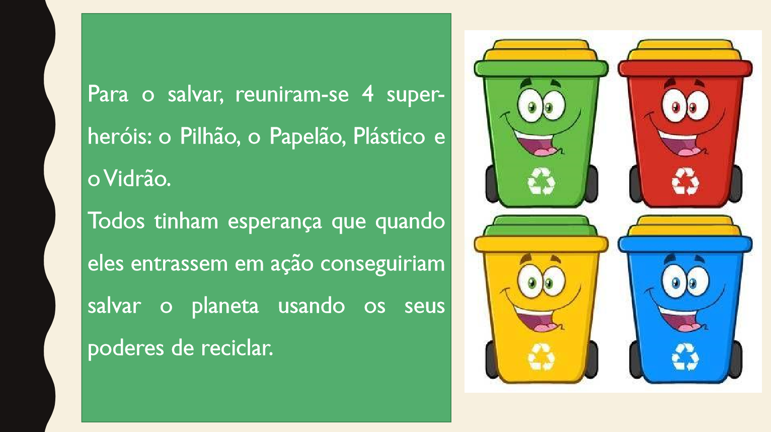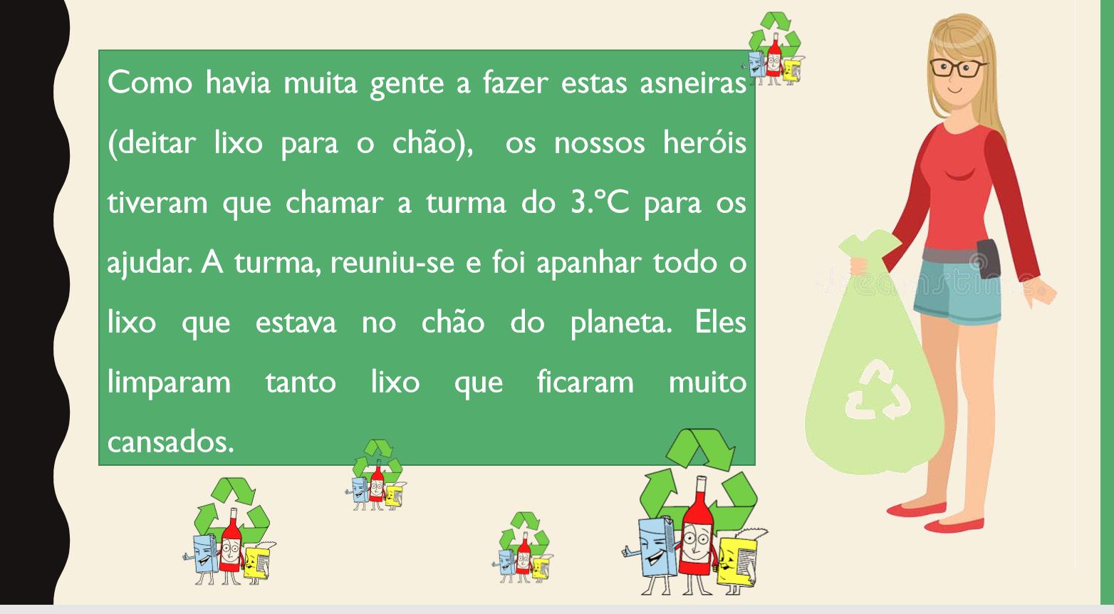 O ponto de partida da história era o tema ambiente. Depois, todos os alunos foram dando ideias e construímos a história apresentada. Até o presidente Trump entrou na nossa história 😉