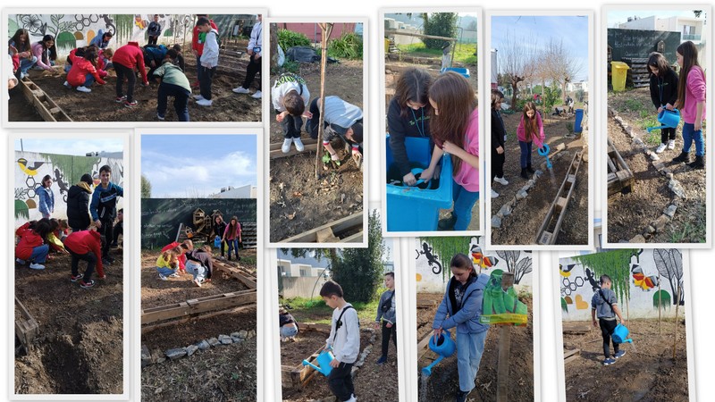 Empenho de todos, professores, alunos e auxiliar de ação educativa nas diferentes tarefas da horta.