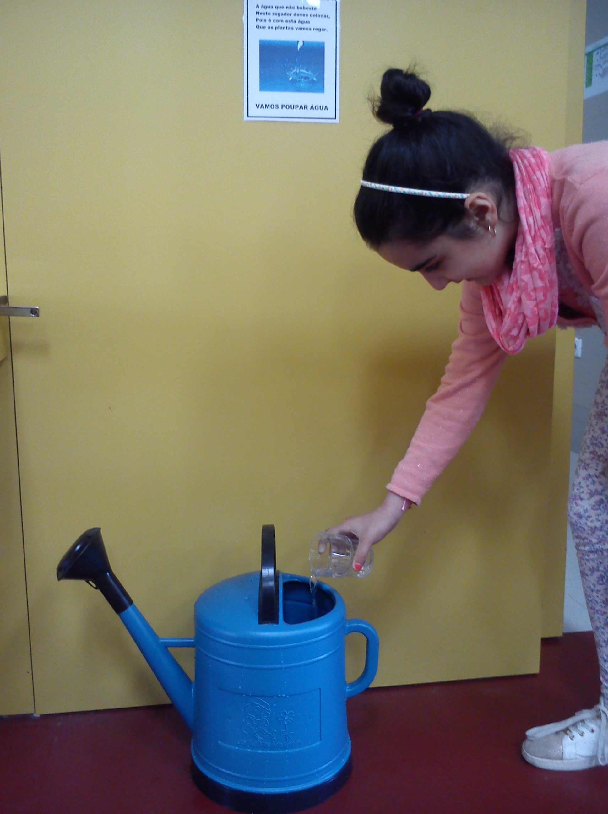 Para combater o desperdício de água não consumida no refeitório da escola, os alunos depositam a água num regador que, posteriormente vai ser utilizada para regar as plantas da escola.