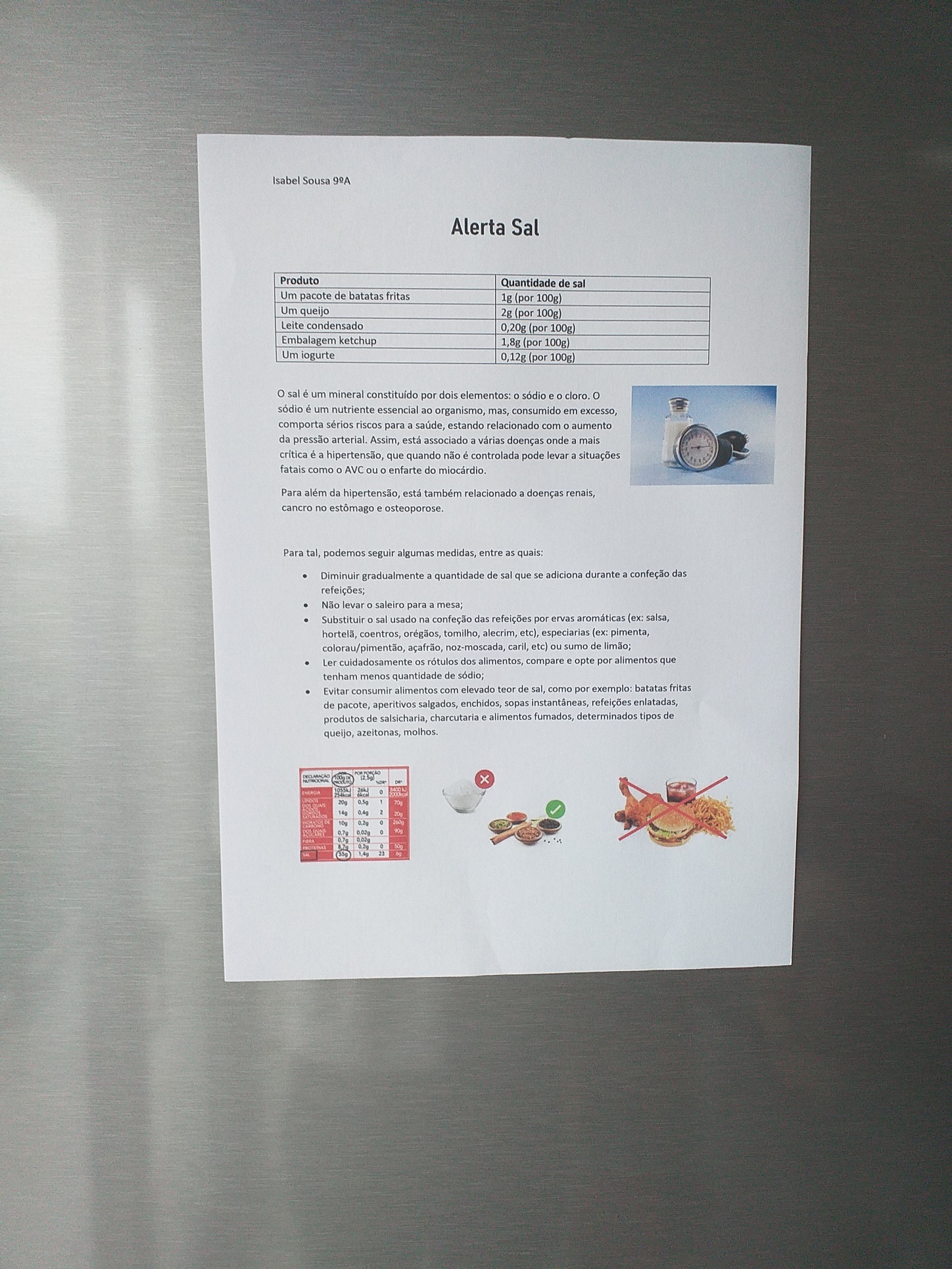 Esta atividade foi lançada pela ABAE e pretende que seja realizada a verificação da quantidade de sal em alimentos consumidos com frequência pela família. A Escola Básica de Palmeira, na disciplina de Ciências Naturais, solicitou aos alunos de várias turmas de 9.º ano, a elaboração de uma tabela, a colocar na cozinha, na porta do frigorífico. Os alunos, de um modo geral, acolherem com entusiasmo esta iniciativa e envolveram também as suas famílias.