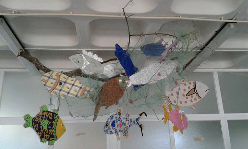 Reaproveitamento de resíduos diversos para construção de candeeiros e telas para a exposição de trabalhos efetuados no âmbito das disciplinas de Educação Visual “Peixes do meu Tejo” e Tecnológica “candeeiros com resíduos”.