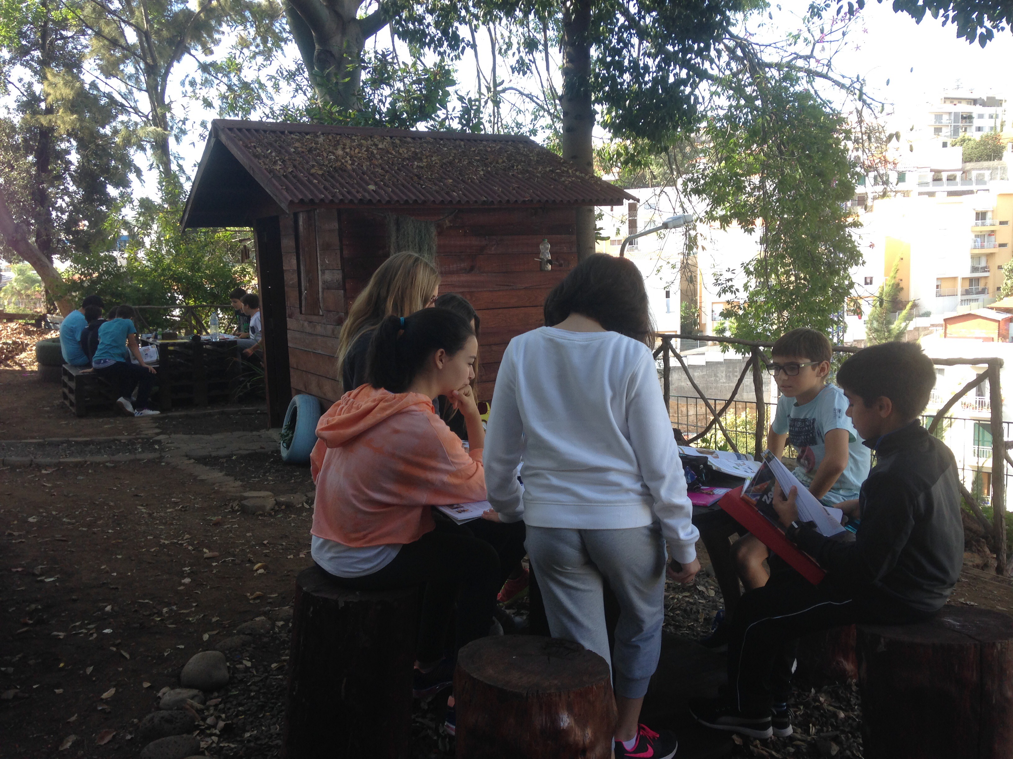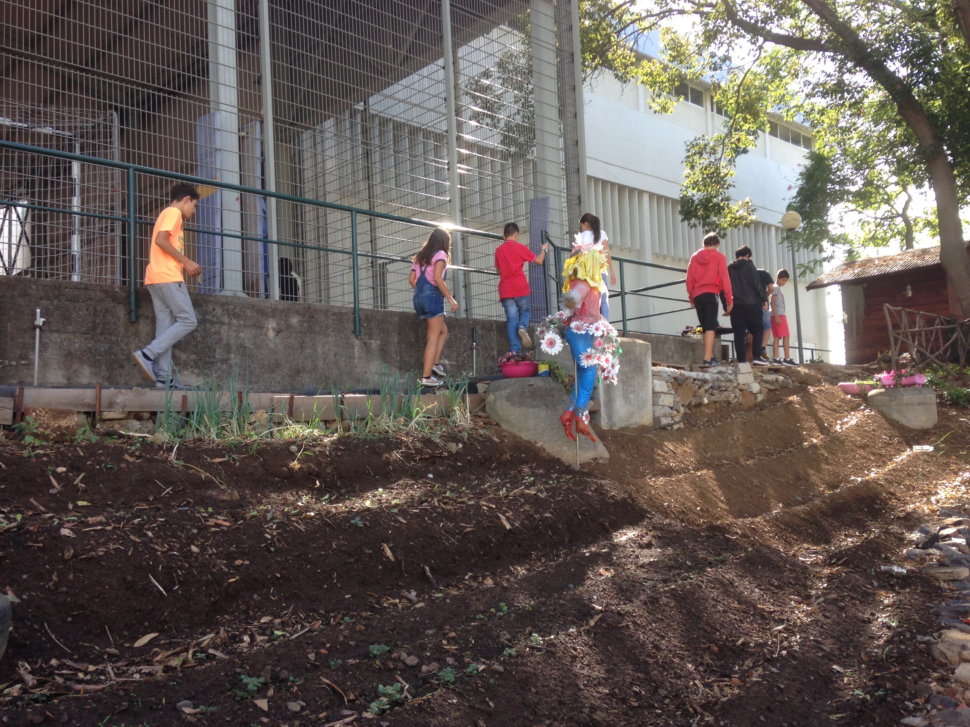 Na aula de Química os alunos estão a aprender o conceito de transformação Física e Química. O espaço que envolve a bio-horta foi utilizado para os alunos, em grupos, poderem investigar e usar exemplos de forma a identificar estes tipos de transformação.