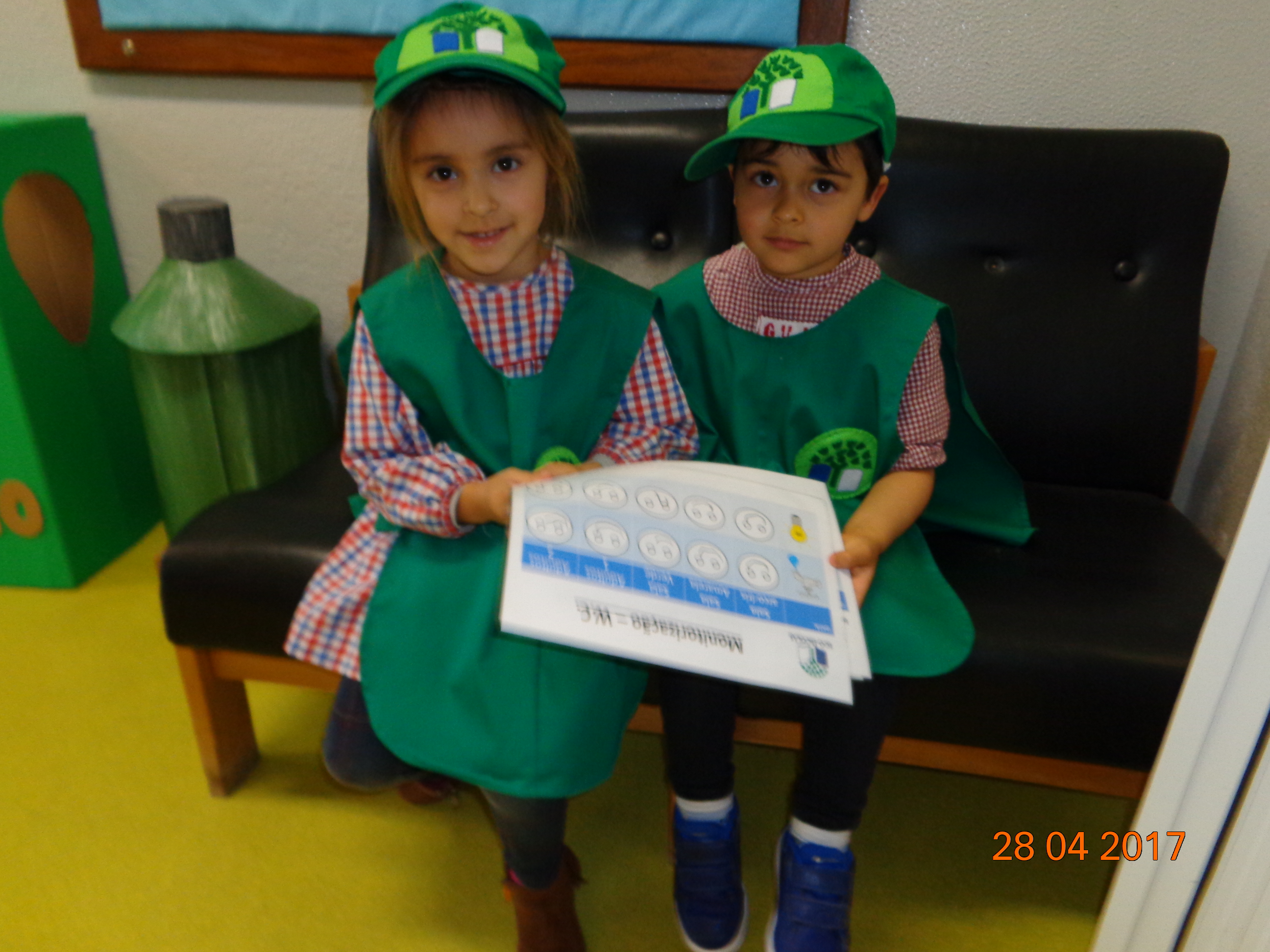 Assimilados os valores inerentes às práticas a implementar como contributo à proteção do meio ambiente (nos temas água, energia e resíduos) as crianças de 3 e 4 anos, aos pares e devidamente identificadas, fazem a verificação dos comportamentos e hábitos diários nos diferentes espaços do infantário, desde as salas de atividade, direção, secretaria, sala de computadores, refeitório, cozinha, polivalente e casas de banho.