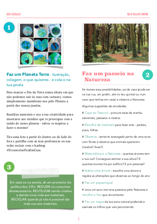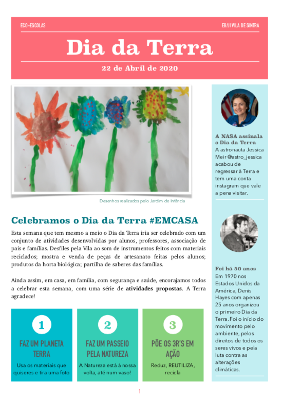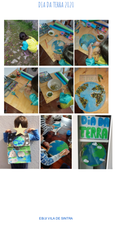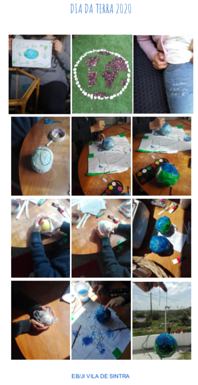 Nestes tempos peculiares que vivemos, em isolamento, longe da escola e dos amigos, a EB/JI da Vila de Sintra quis ainda assim marcar os 50 anos de celebração do Dia da Terra. Tinha sido planeado um desfile pela Vila de Sintra ao som de instrumentos elaborados com materiais reciclados e cartazes ilustrativos dos ODS mas tal não foi possível por isso foi lançado o desafio de cada aluno/família marcar o dia construindo ou desenhando um Planeta Terra e colocando em local visível à janela ou à porta para lembrar a transeuntes e vizinhos o dia que se estava a celebrar.