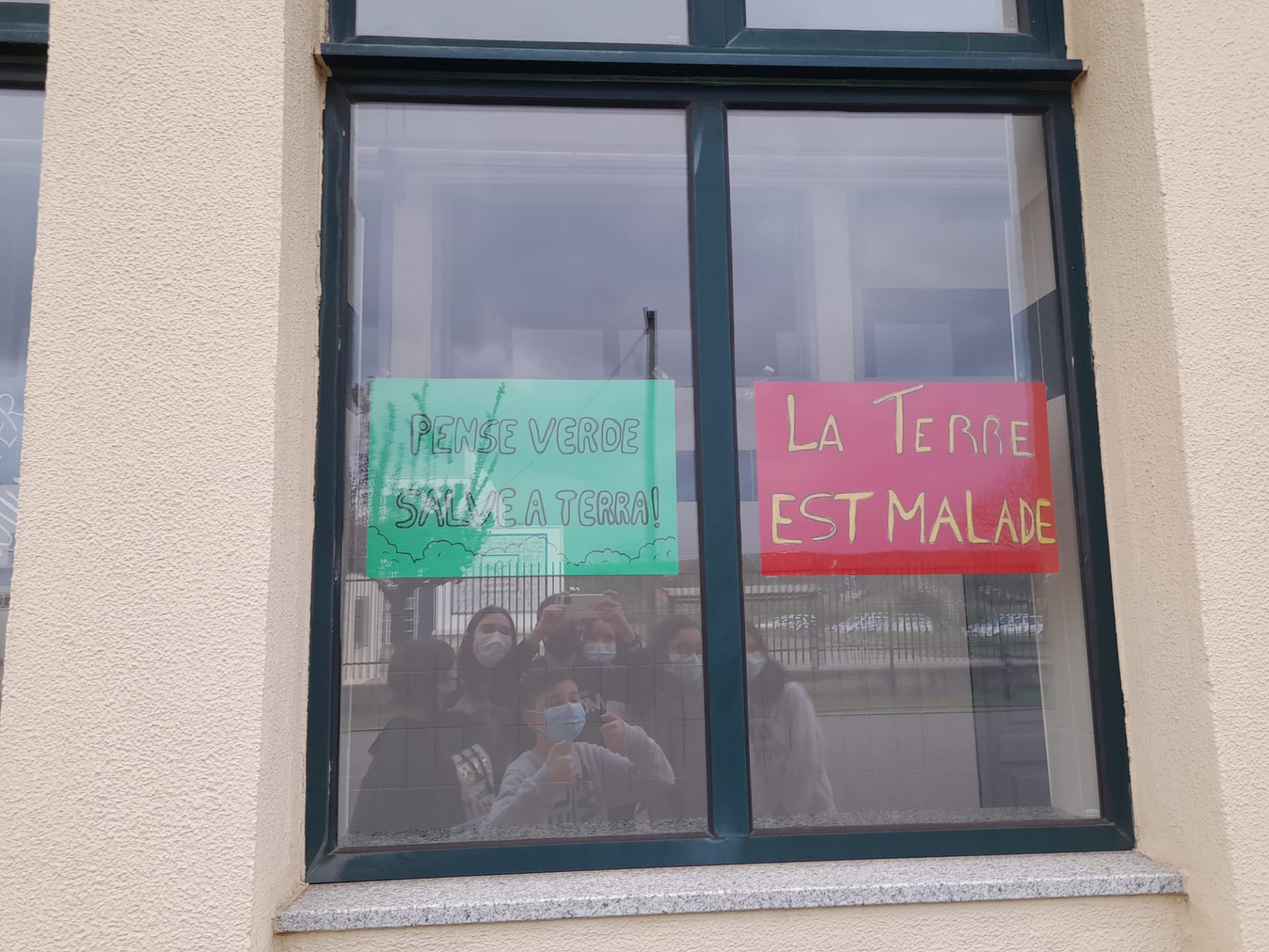 Foi realizada uma exposição nas janelas do edifício escolar com frases de alerta em defesa do planeta Terra escritas em Português, Inglês e Francês pelos alunos.