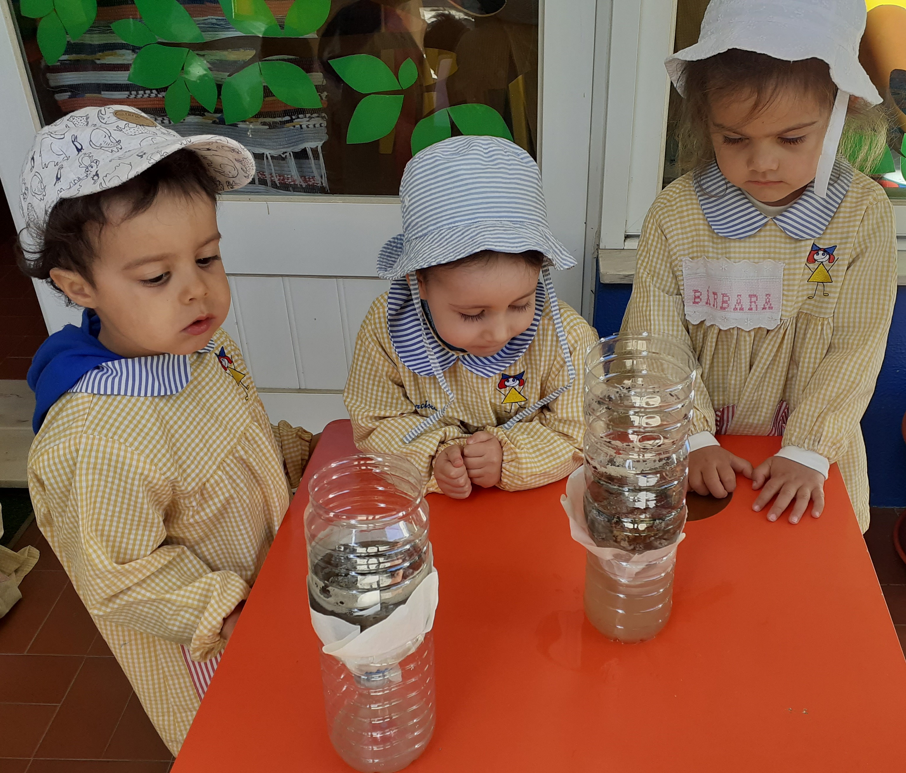 Nesta atividade, as crianças foram sensibilizadas para a temática da água através da construção de um aquífero que demonstra como a água é filtrada pelo solo e chega limpa e pronta para consumo aos reservatórios subterrâneos de água.