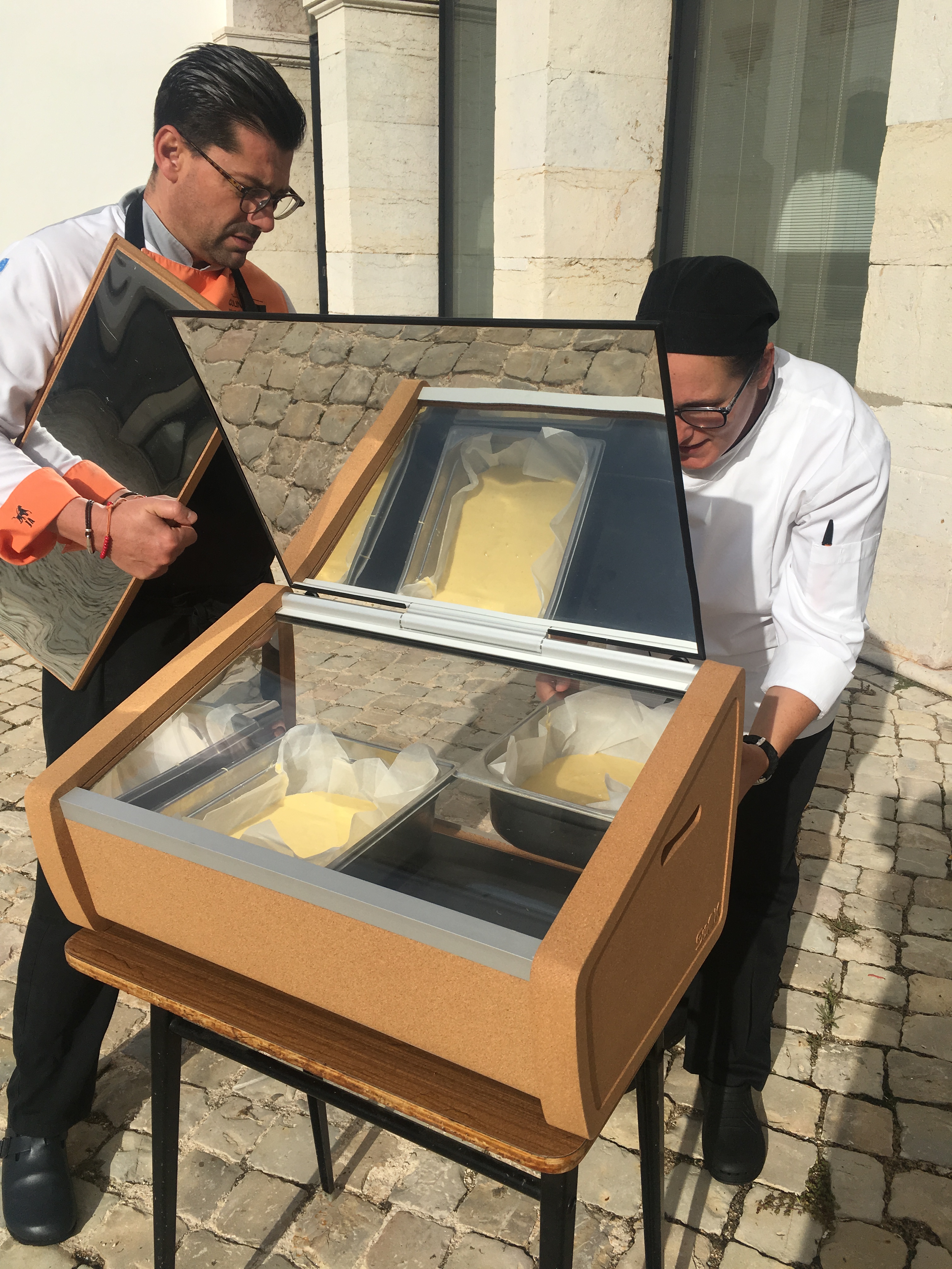 Desta forma utilizamos um forno solar 100% de produção nacional, utilizando a energia solar para produção alimentar, reduzindo o efeito de estufa e gastos energéticos não sustentáveis;
