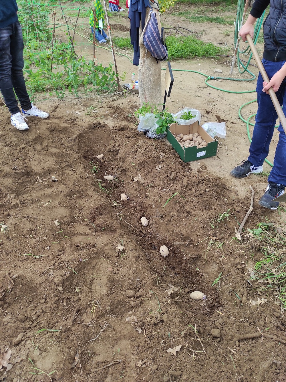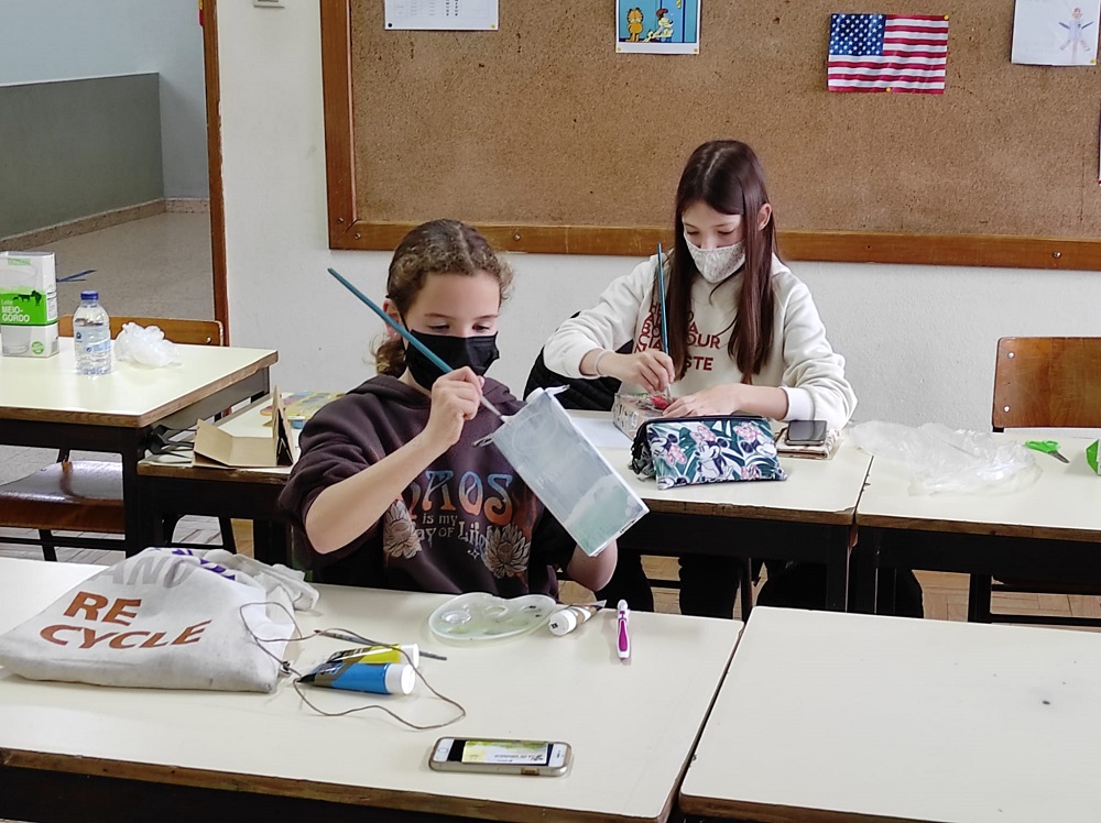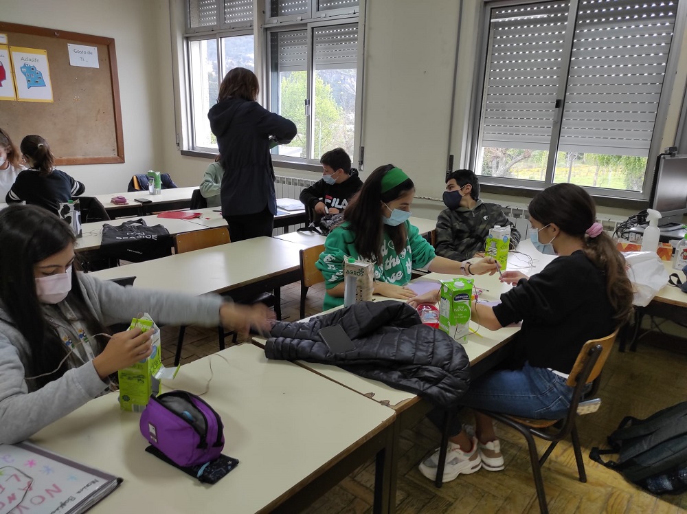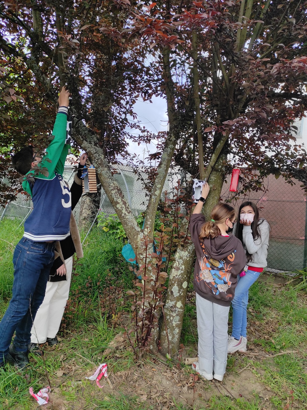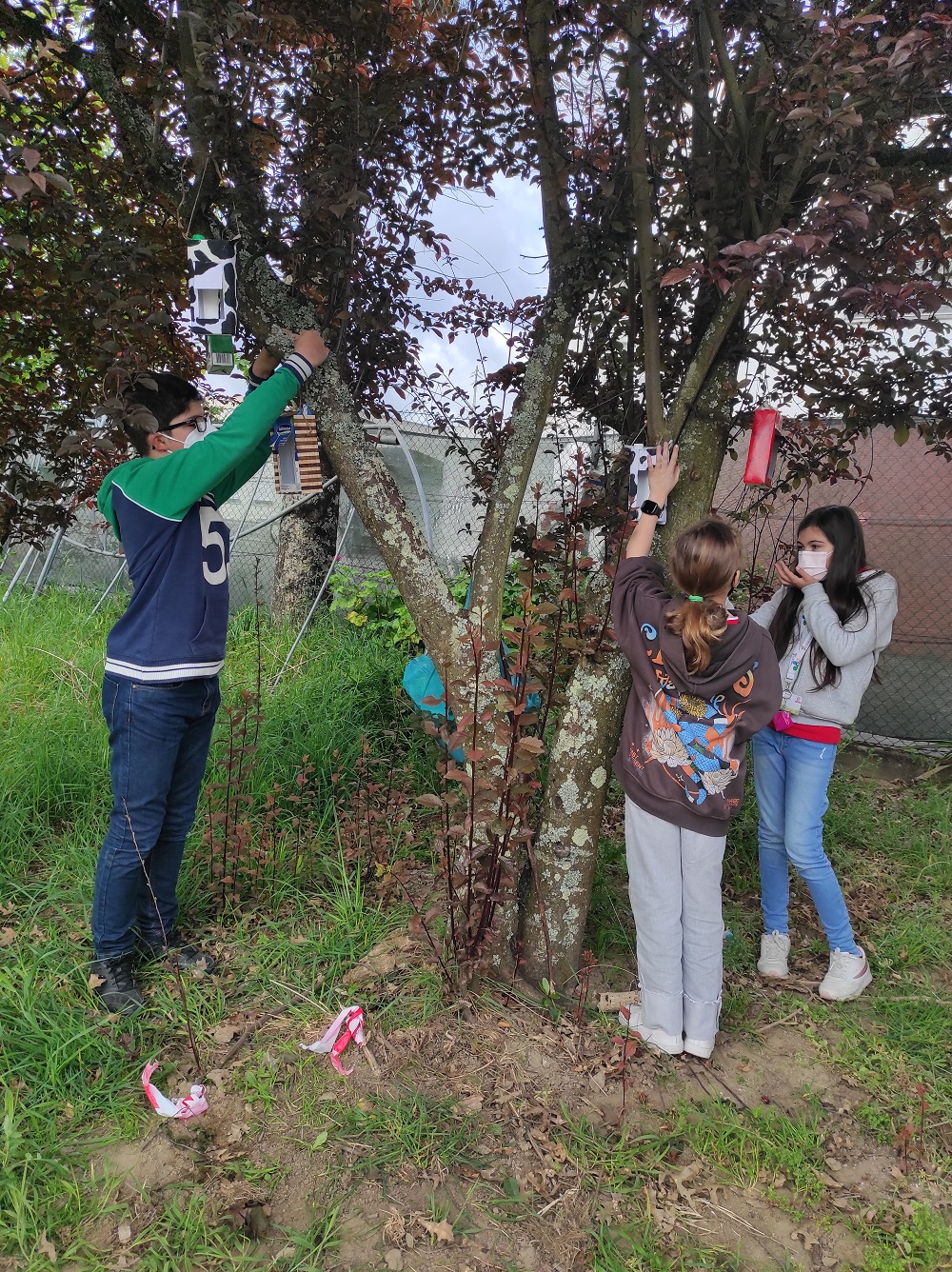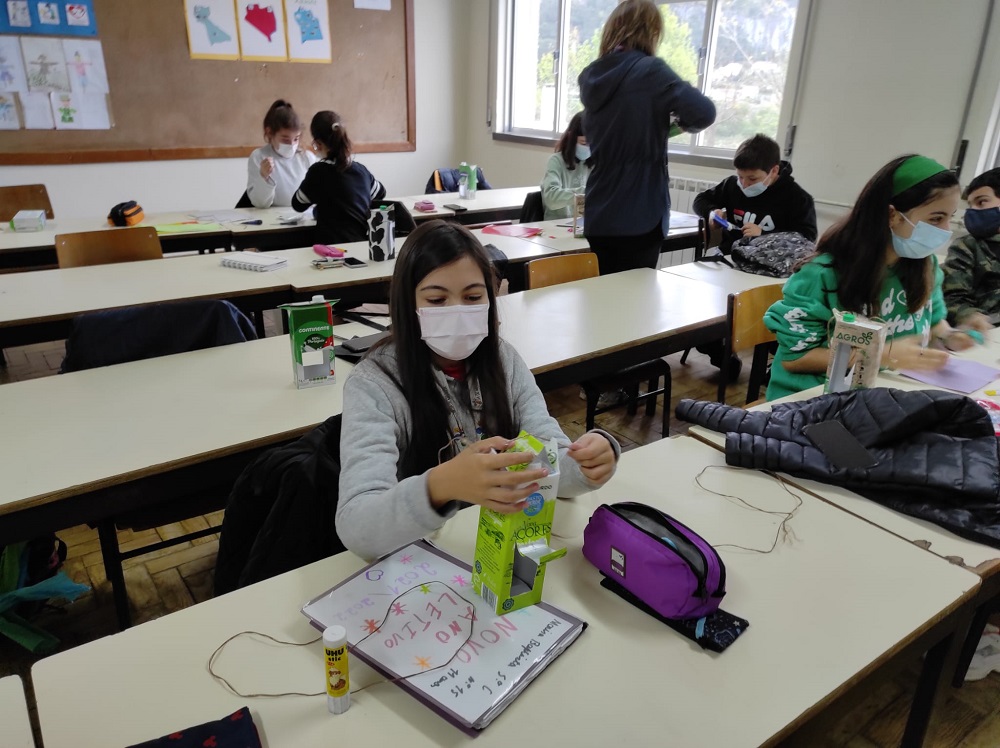 Uma turma de 5.º ano, em contexto de sala de aula, criou comedouros de aves recorrendo à reutilização de resíduos e posteriormente deslocaram-se à Horta da Escola e colocaram os comedouros construídos nas árvores.