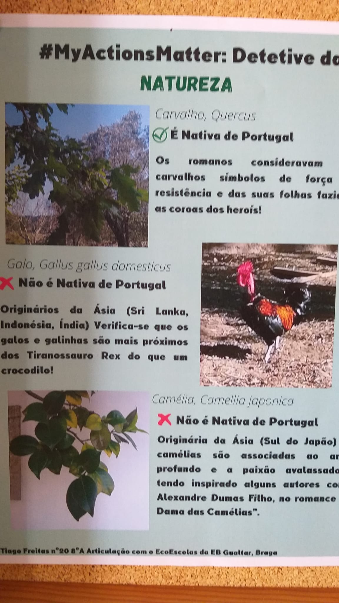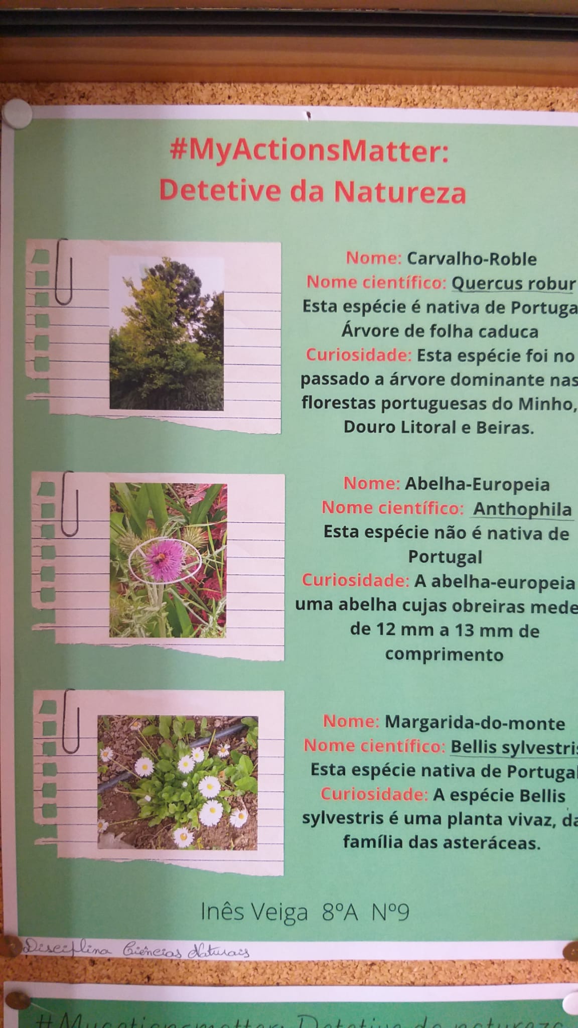 Os alunos instalaram a App iNaturalist e foram convidados a percorrer o recreio para identificar plantas e animais, descobrindo se as espécies fotografadas são nativas ou não e outras características distintivas. A partir da informação pesquisada elaboraram-se cartazes individuais, recorrendo à ferramenta digital Canva, que foram apresentados numa exposição conjunta.