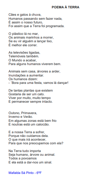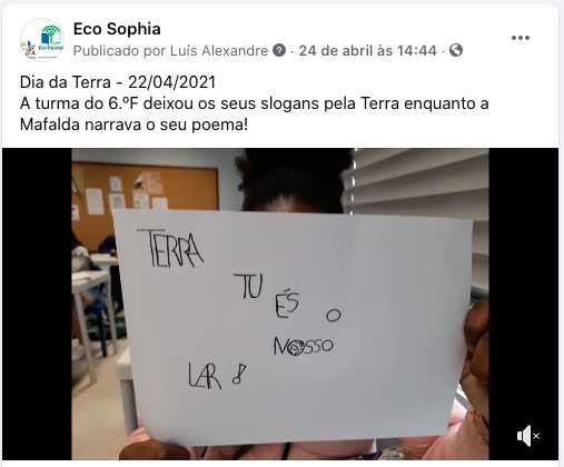 Realizou-se Um Minuto de Silêncio de Gratidão à Terra após visionamento de um vídeo, de acordo com proposta da Associação Fazedores da Mudança. Foram também realizadas atividades do Dia da Terra sugeridas pelo PNL – Ler+ (Atividade 1: Dá a tua voz! e Atividade 2: Como Alice!). Além disso, foram promovidas recolhas de tampinhas, rolhas de cortiça, pilhas e caricas, inseridas no Concurso Turma Super Eco, e de outros resíduos como lâmpadas, manuais…