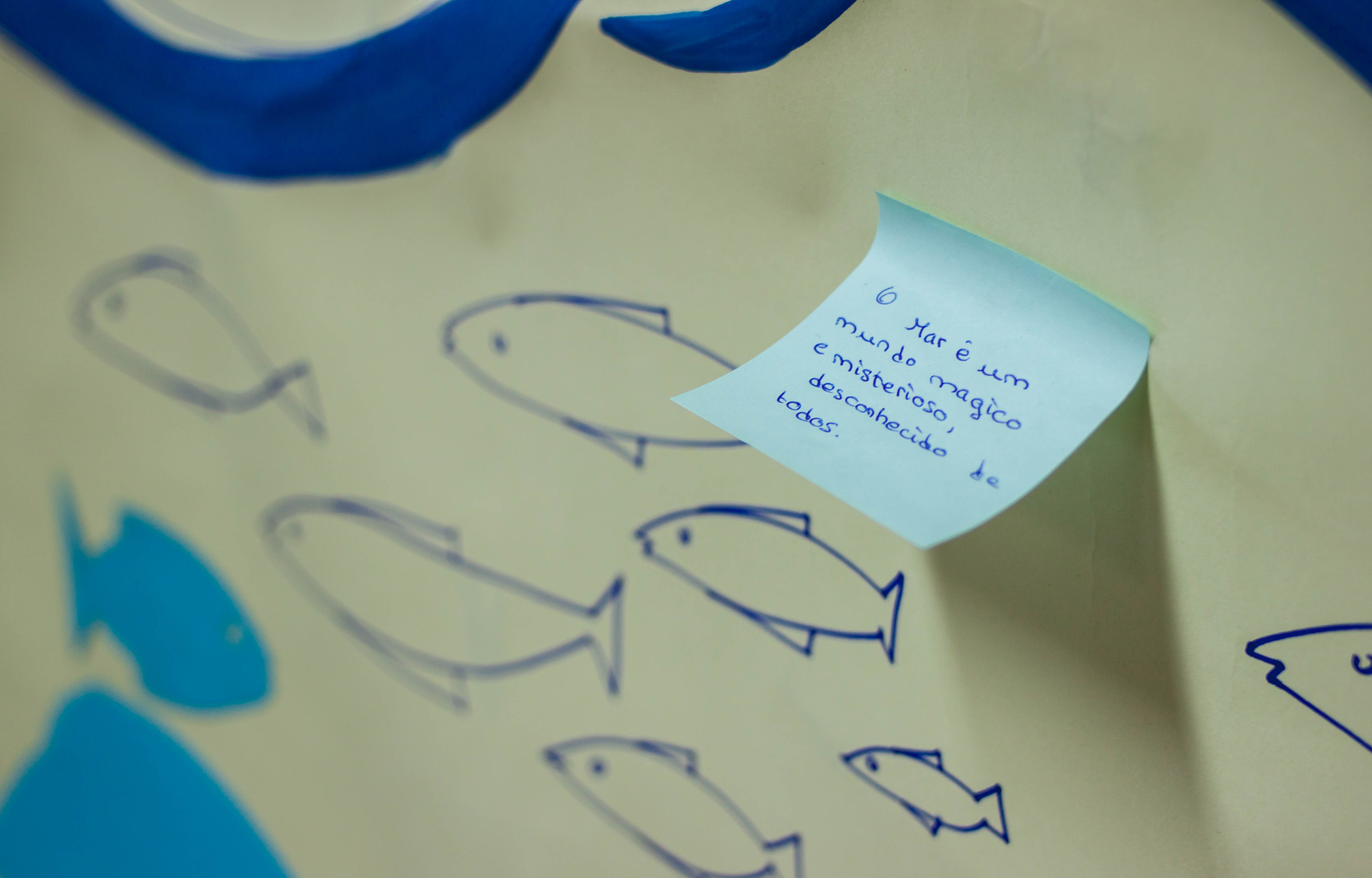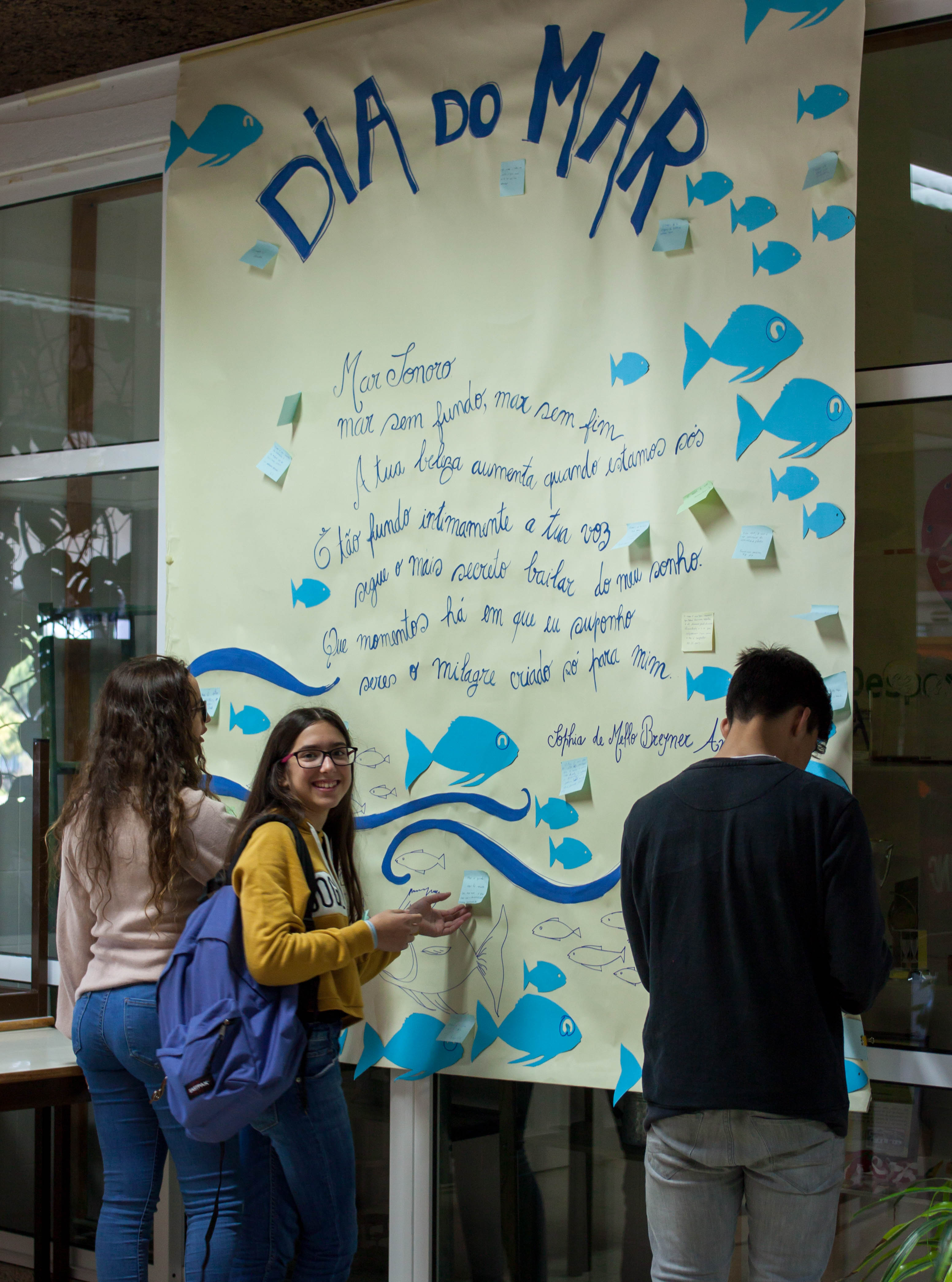 Os alunos num mural no átrio escola escrever mensagens alusivas sobre o mar.
