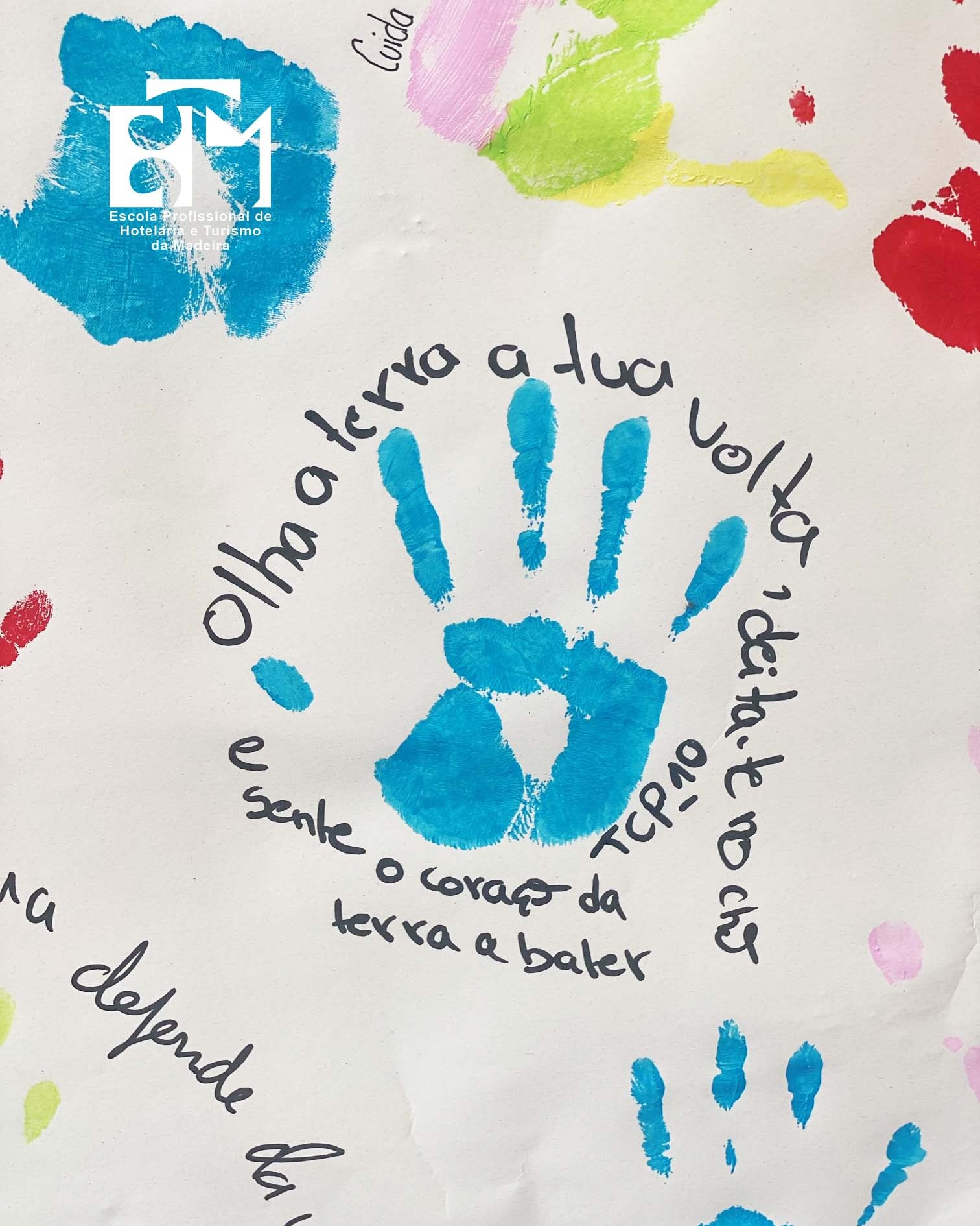 Para simbolizar este dia, fizemos também um mural, onde cada aluno deixou a sua mão e uma mensagem sobre o Planeta.