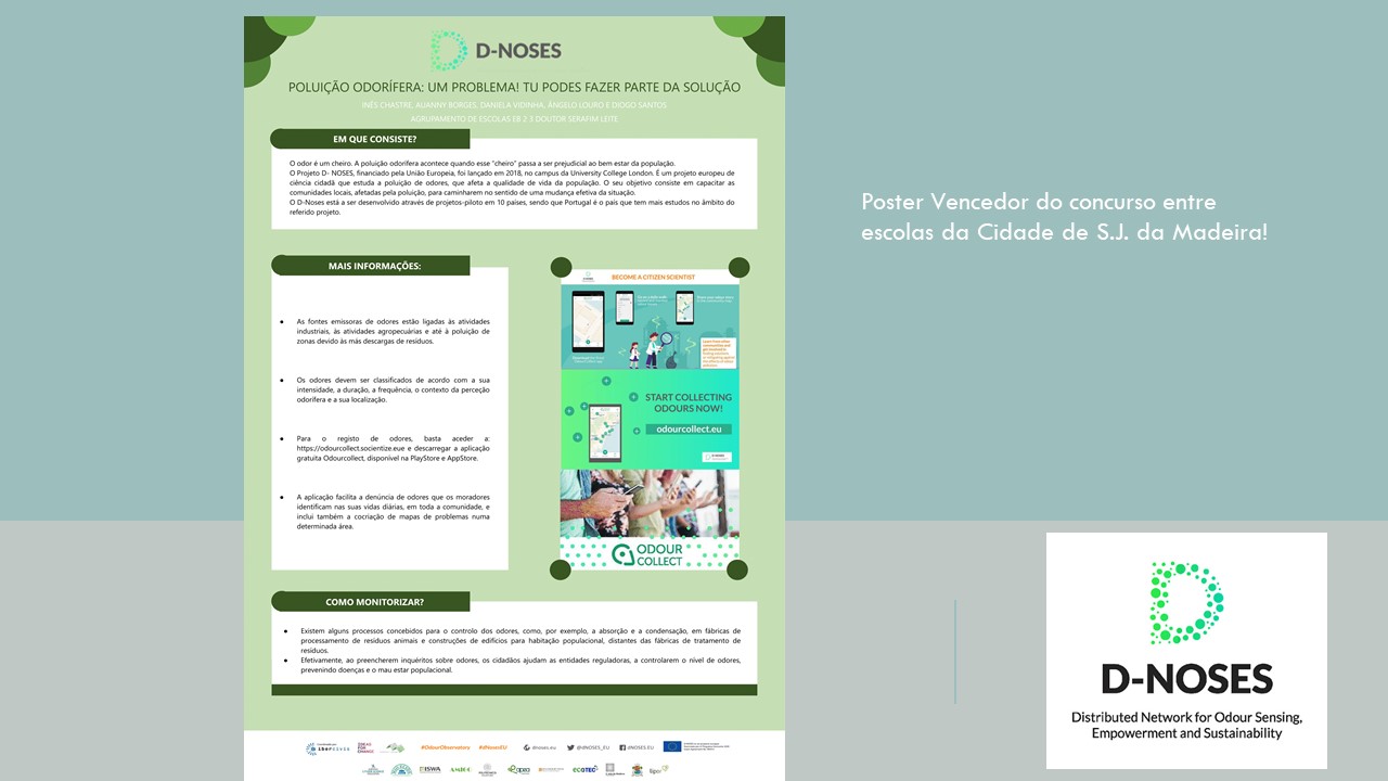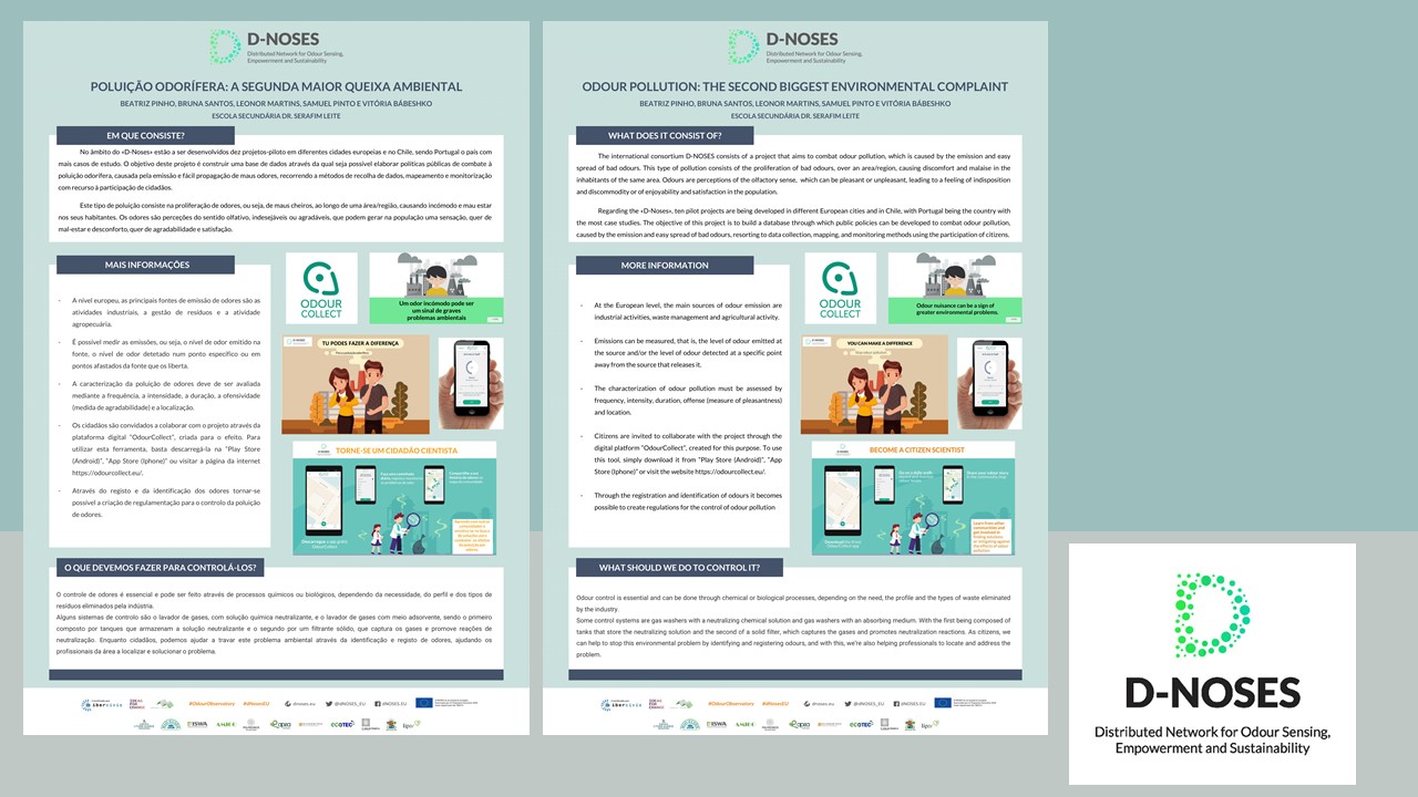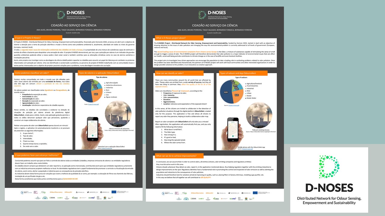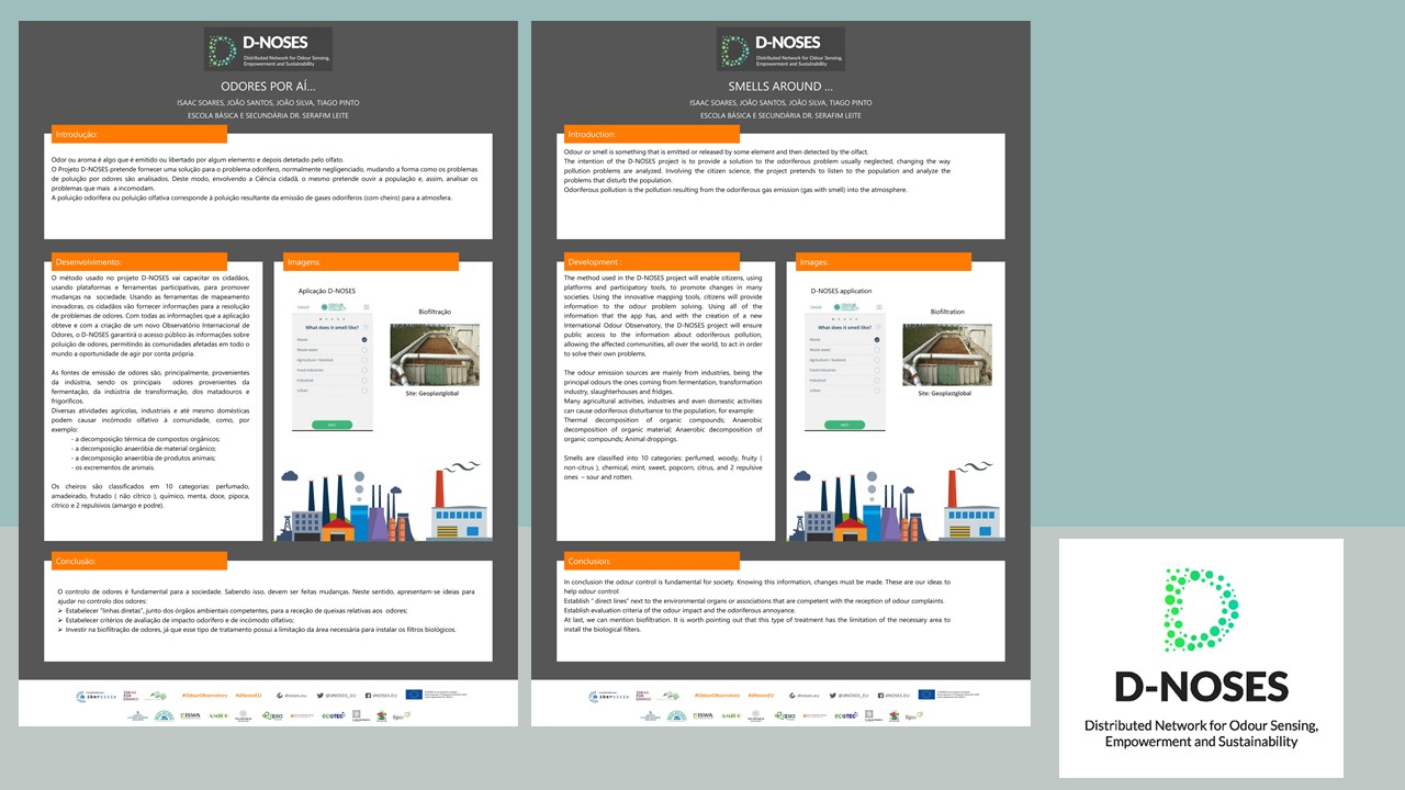 No âmbito deste projeto inovador promovido por um consórcio europeu, que tem como objetivo associar a ciência cidadã ao estudo dos problemas odoríferos, os alunos participaram em diversas iniciativas, desde sessões de formação na temática dos odores bem como a elaboração de posters de divulgação do referido projeto, sempre com a preocupação de mostrar que, em toda a Europa, a poluição odorífera é um dos grandes motivos para as reclamações ambientais dos cidadãos. Além disso elaboraram as questões que fizeram parte de um questionário aplicado à população e no âmbito da disciplina de Matemática procederam ao tratamento dos resultados agora apresentados no webinar.