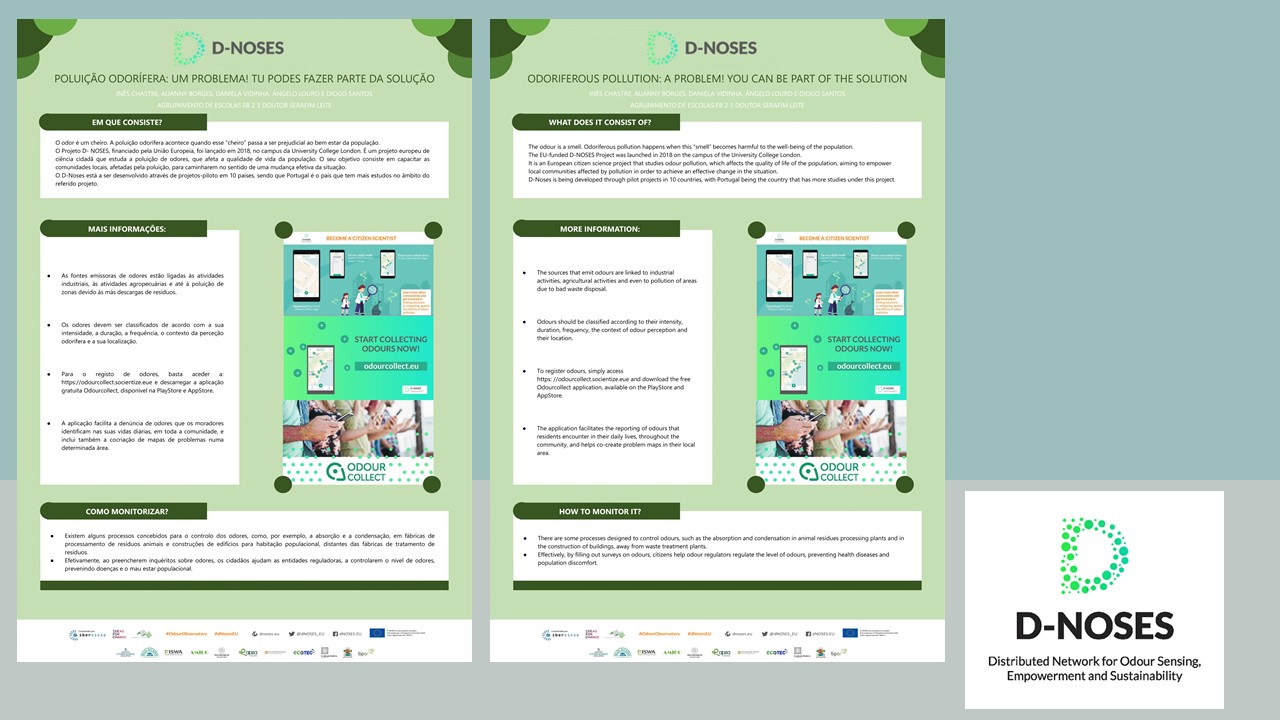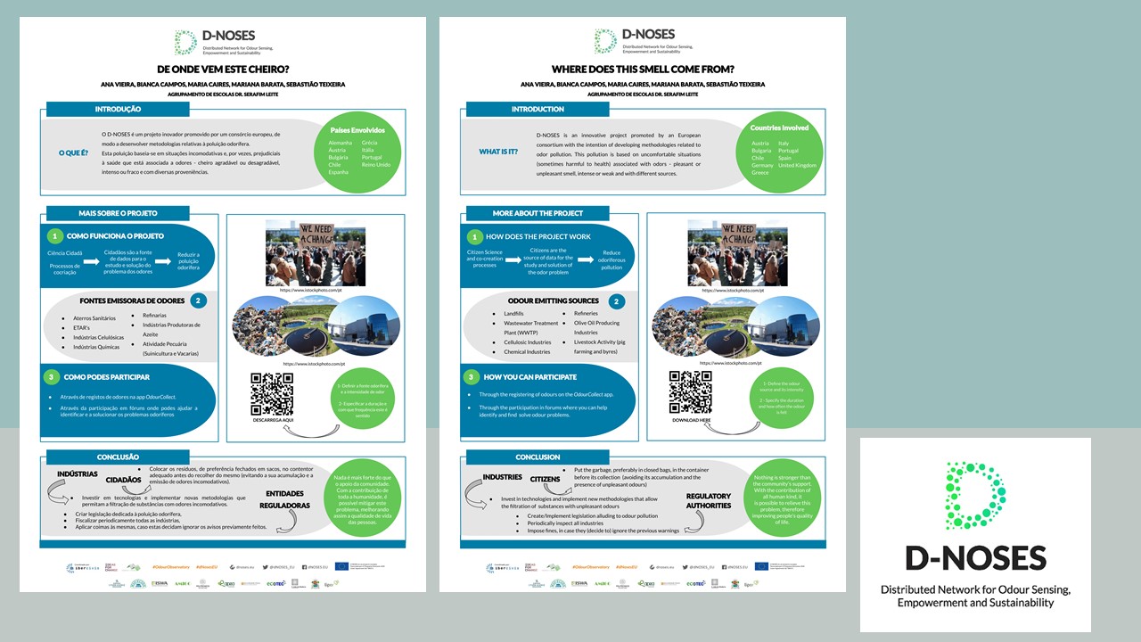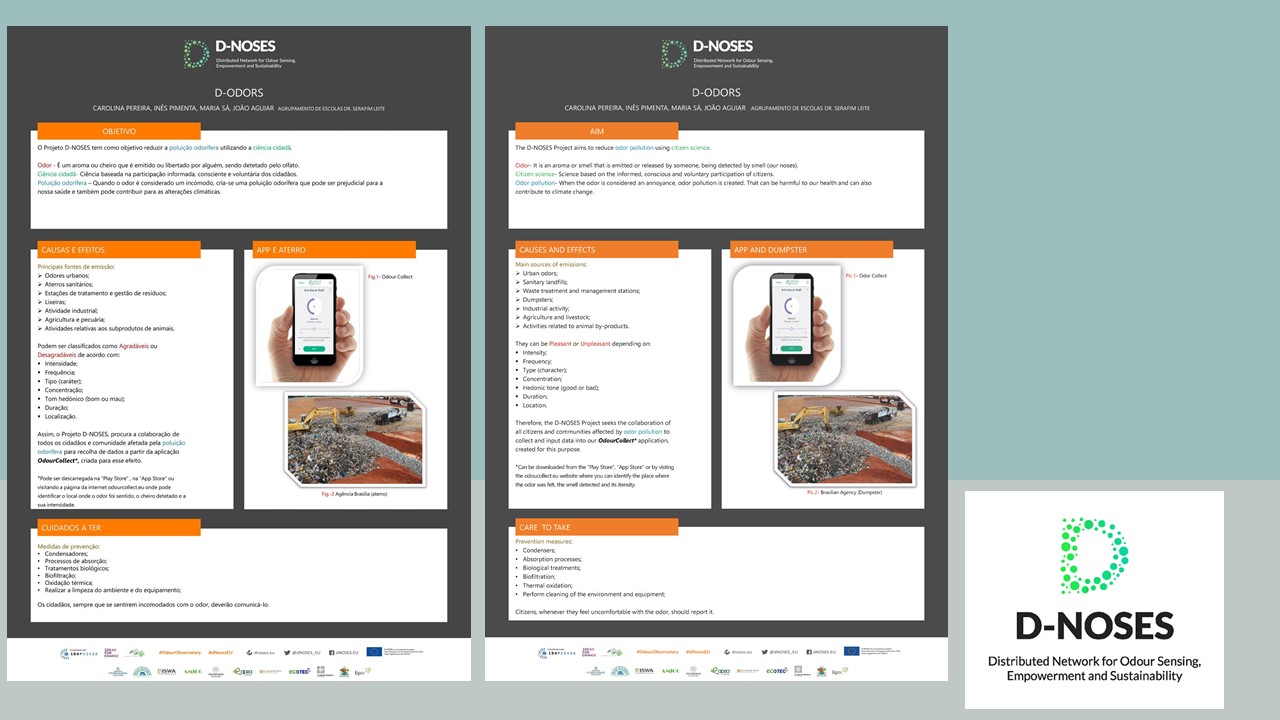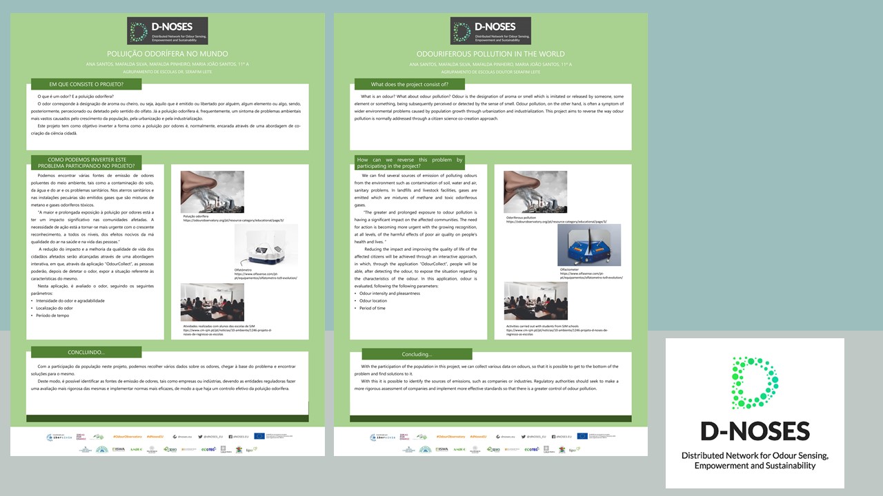 No âmbito deste projeto inovador promovido por um consórcio europeu, que tem como objetivo associar a ciência cidadã ao estudo dos problemas odoríferos, os alunos participaram em diversas iniciativas, desde sessões de formação na temática dos odores bem como a elaboração de posters de divulgação do referido projeto, sempre com a preocupação de mostrar que, em toda a Europa, a poluição odorífera é um dos grandes motivos para as reclamações ambientais dos cidadãos. Além disso elaboraram as questões que fizeram parte de um questionário aplicado à população e no âmbito da disciplina de Matemática procederam ao tratamento dos resultados agora apresentados no webinar.