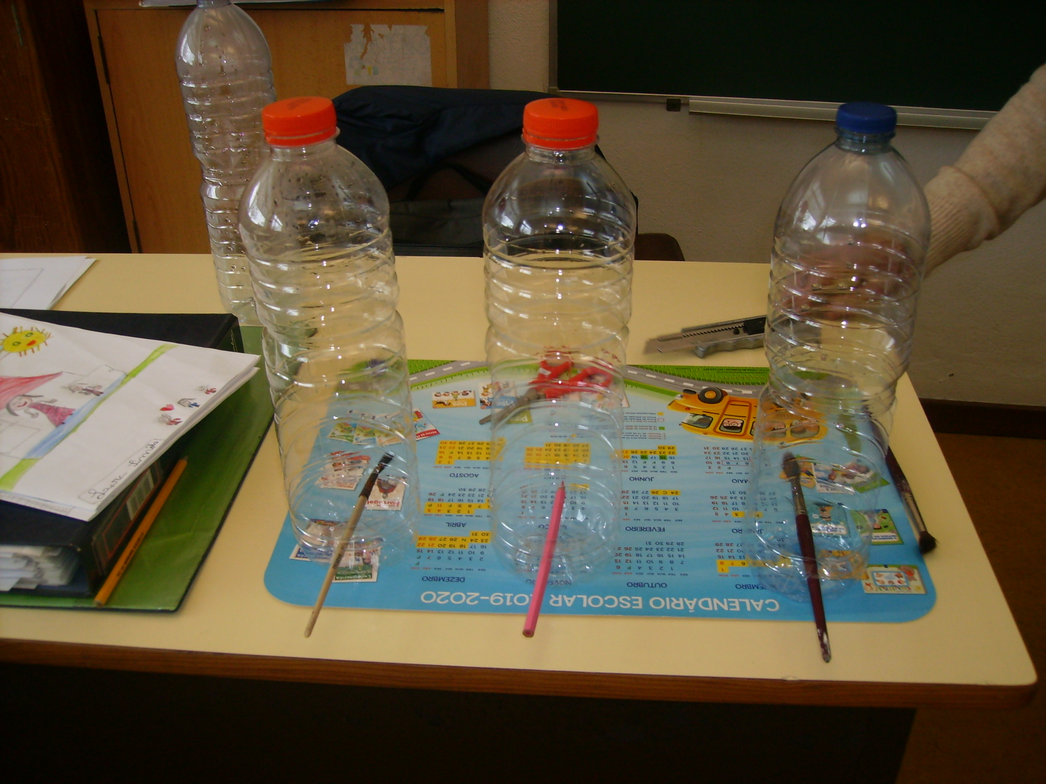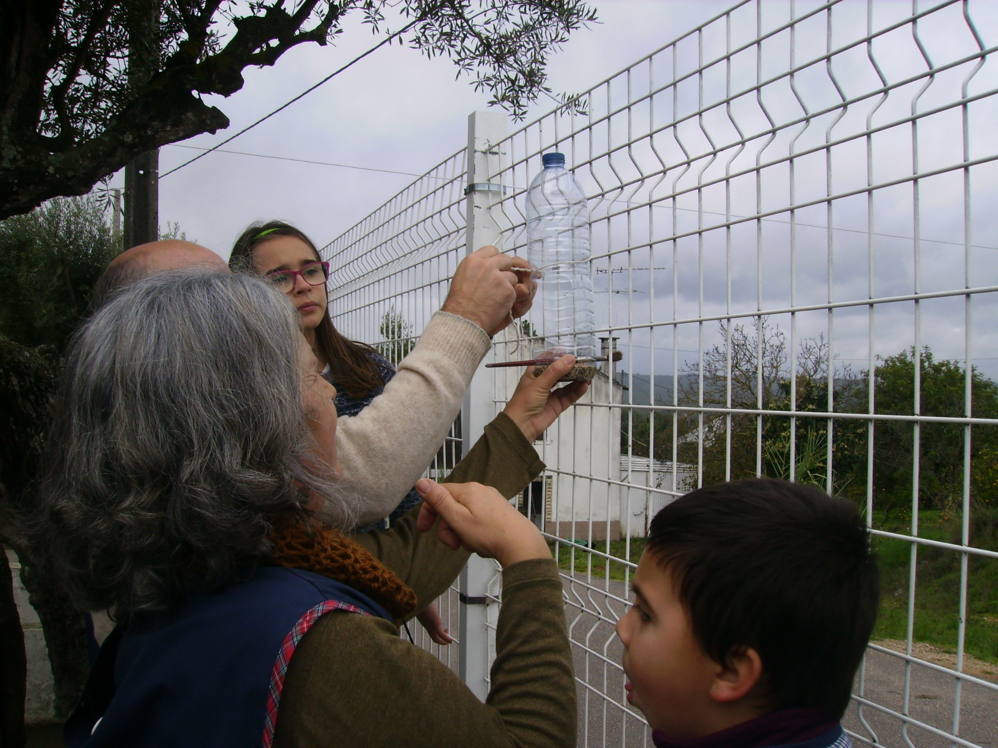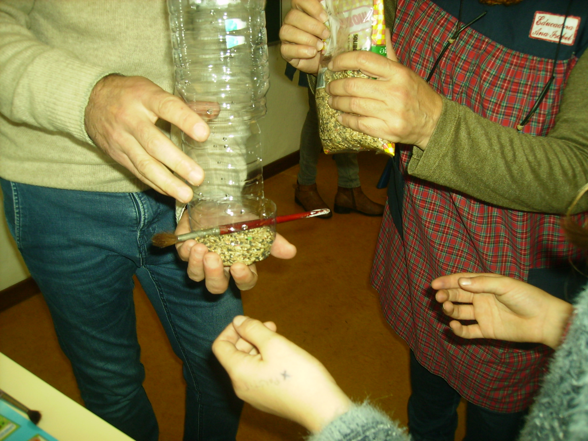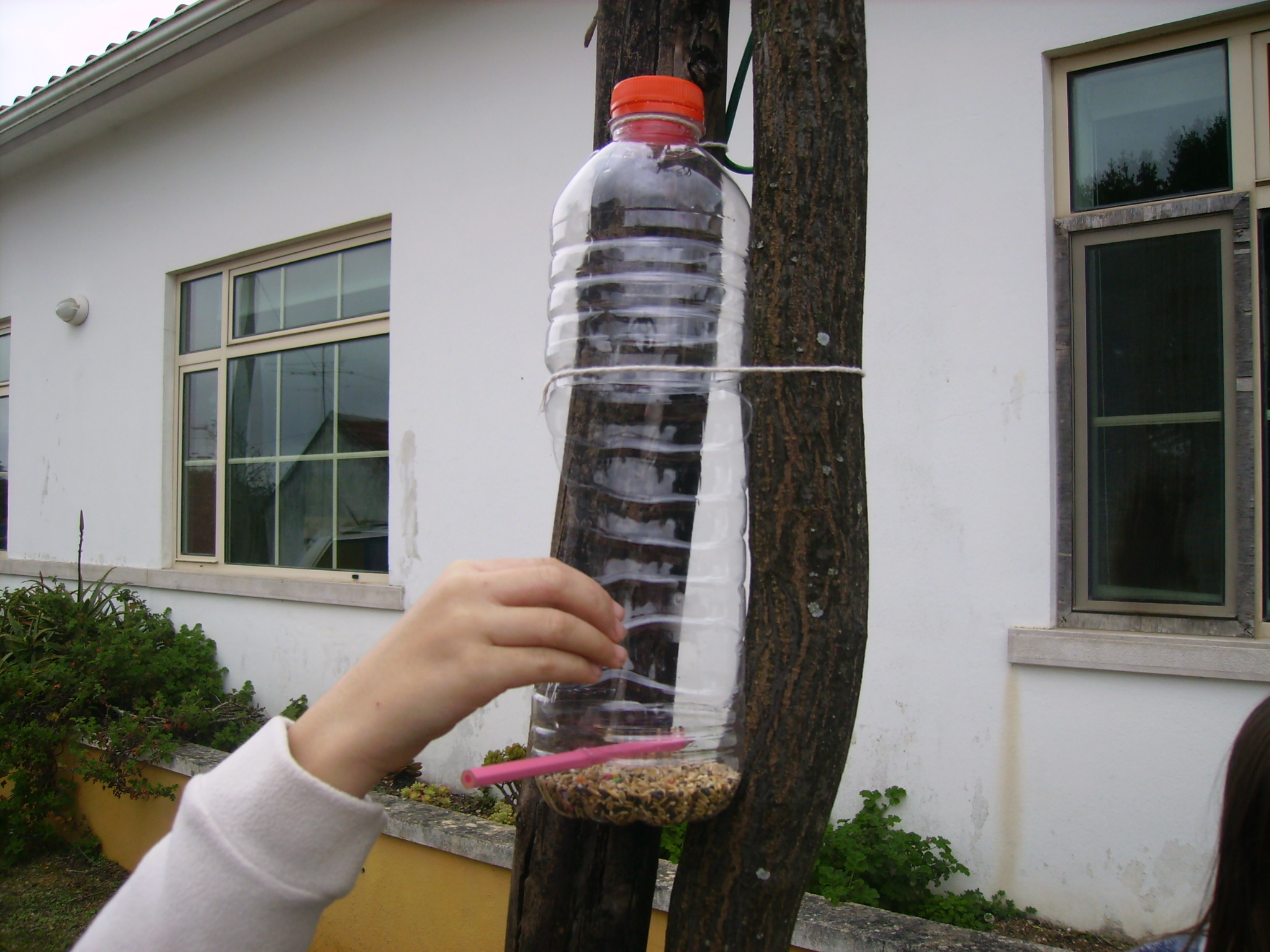 Usando materiais reciclados construímos comedouros para os passarinhos e colocamo-los no pátio da escola e na zona envolvente à mesma, com o compromisso de semanalmente, os alunos irem repondo a comida nos comedouros.