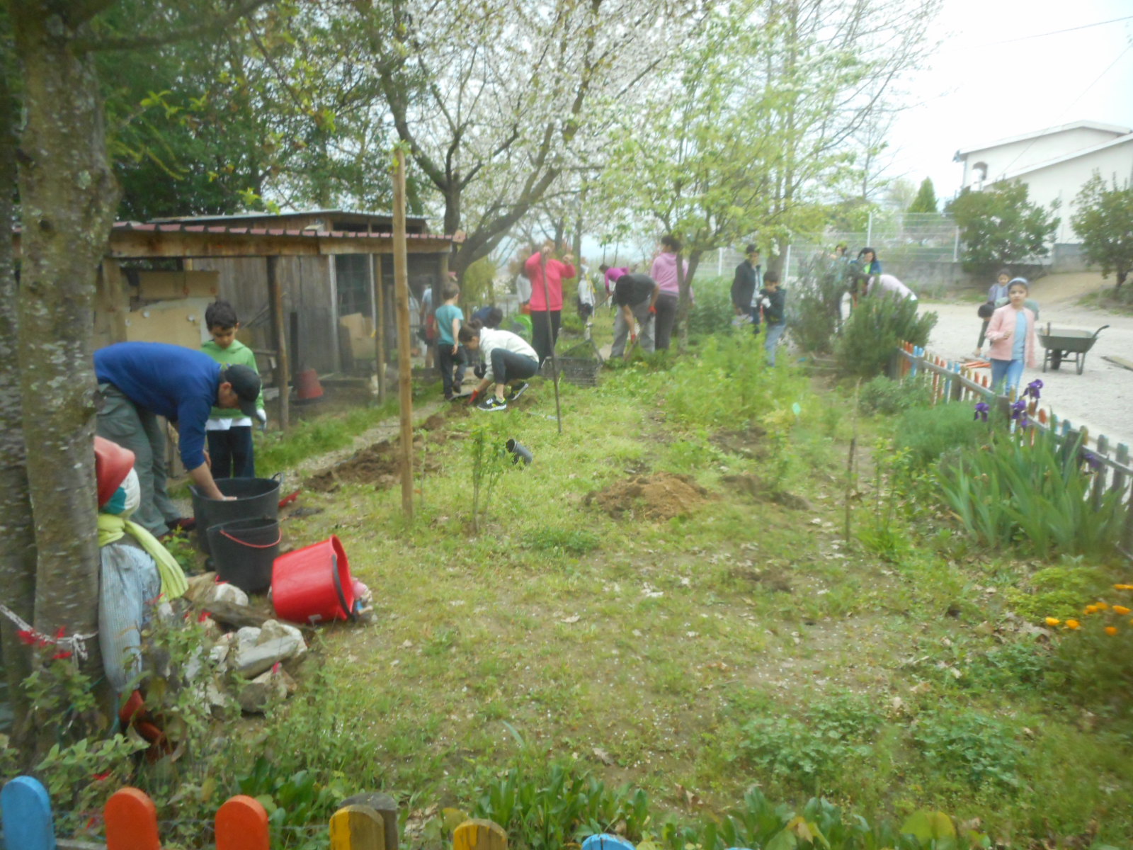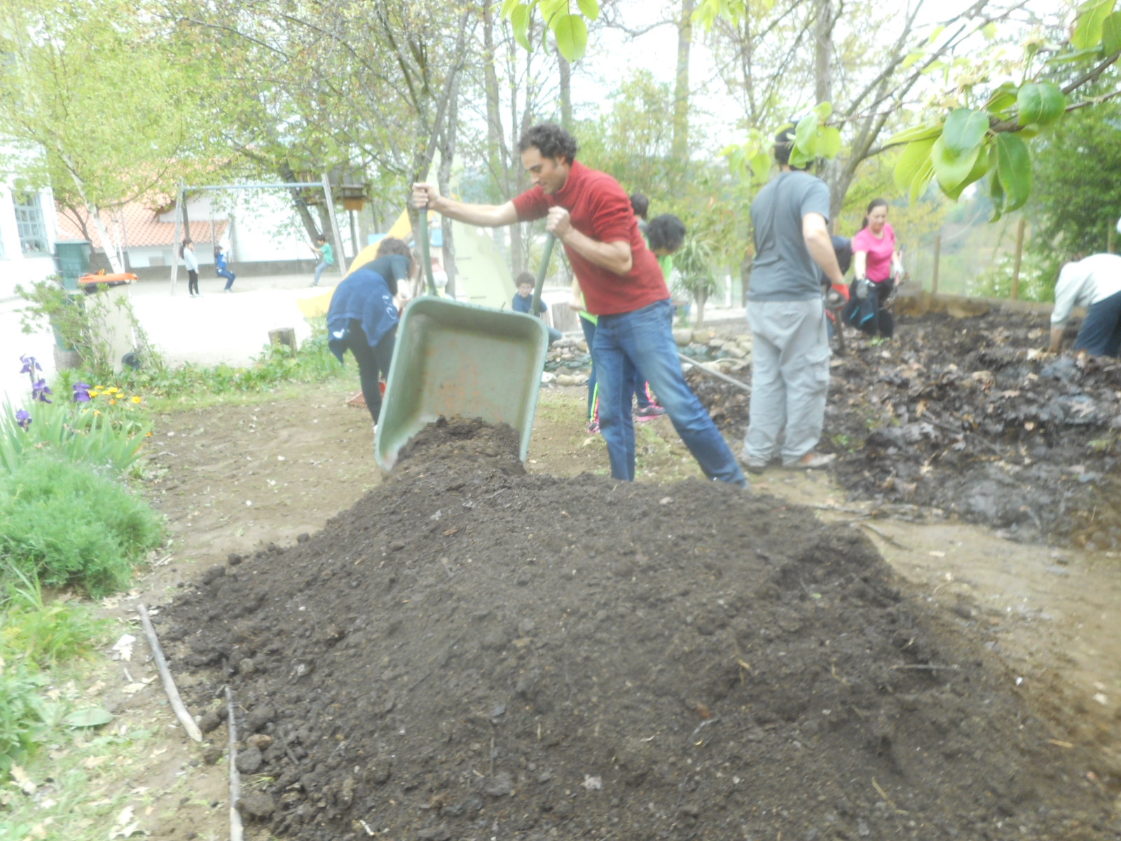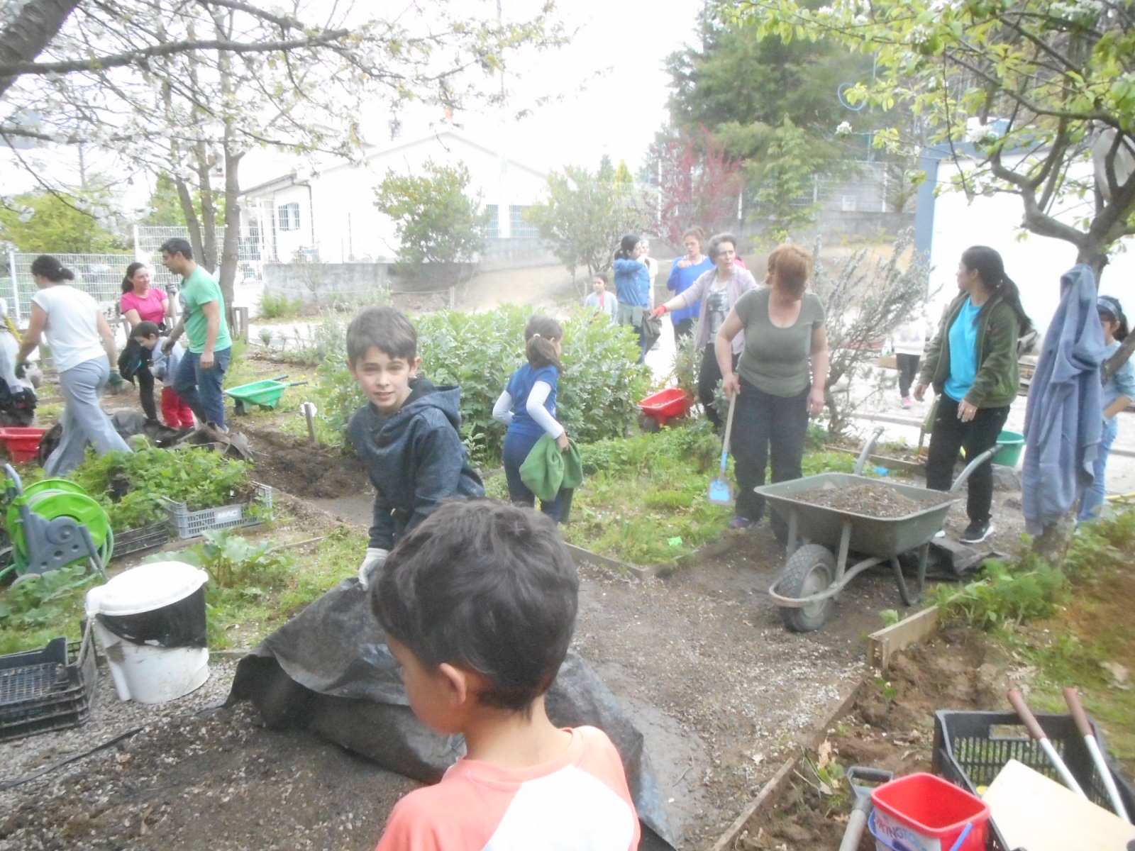 Promovemos um Eco-Sábado para comemorarmos o Dia da Terra convidando os pais das nossas crianças para ajudarem nos trabalhos da horta biológica da escola. Os pais vieram logo de manhã, acompanhados dos filhos para colaborarem e começamos por mudar a água do lago. Pretendemos requalificar este espaço porque a vedação está degradada, o galinheiro não tem as condições desejadas para albergar as galinhas e os patos, a compostagem precisa de ser revolvida e separada consoante as fases de maturação e queremos substituir a gravilha à volta dos talhões cultivados. Vamos construir um galinheiro novo, uma estufa maior, criar um sistema de gota a gota e elevar os talhões para levarem mais terra. A escola candidatou-se ao orçamento participativo da Câmara Municipal de Vila Real e ganhou, pretendendo utilizar o dinheiro nestas obras de melhoramento. Neste sábado arrancamos a vedação, desfizemos o galinheiro, removemos a gravilha, transplantamos algumas plantas, revolvemos o composto e limpamos o espaço envolvente. Como agradecimento servimos um lanche com infusões das ervas aromáticas da horta e compotas confecionadas na escola com frutos do pomar.