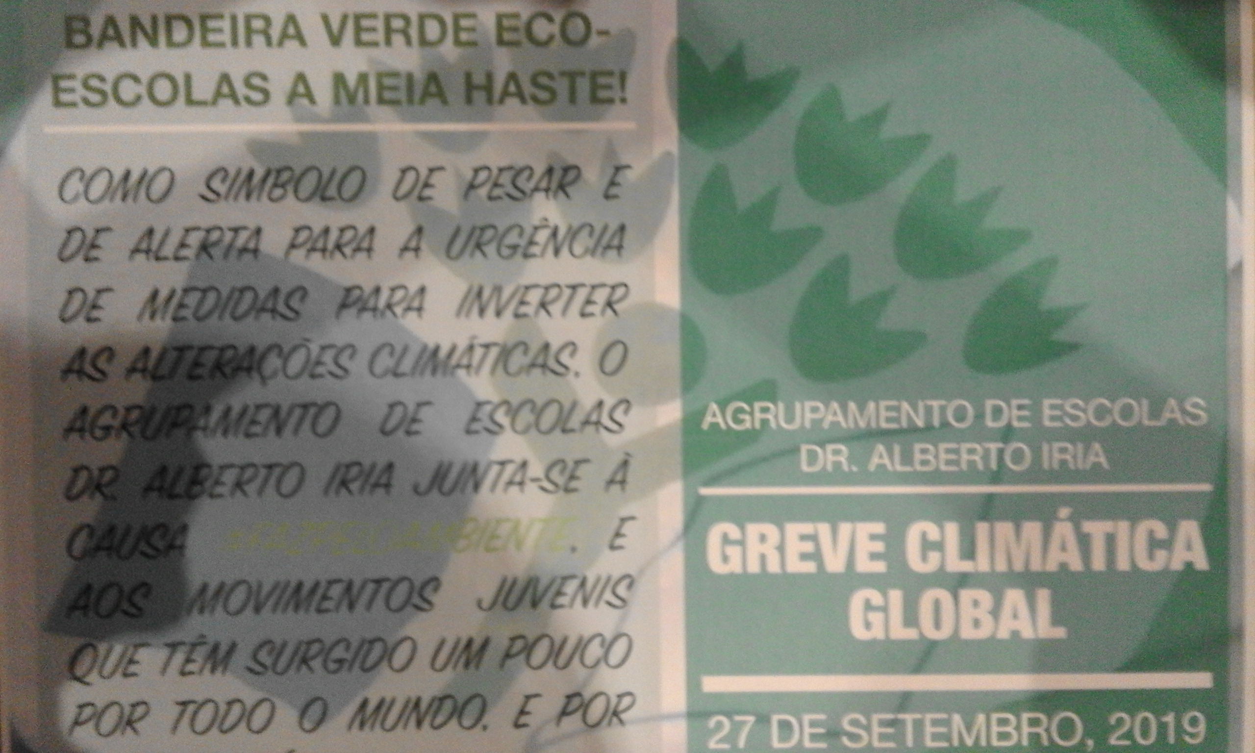 Como símbolo de pesar e de alerta para a urgência de medidas para inverter as alterações climáticas, o Agrupamento de Escolas Dr. Alberto Iria juntou-se à causa “fazpeloambiente, e aos movimentos juvenis que têm surgido um pouco por todo o Mundo, e por todo o país. A Bandeira Verde do Eco-Escolas esteve a meia haste durante os dias 27 e 30 de setembro. Foi ainda elaborado um cartaz para divulgação da Greve Climática Ambiental (27 de setembro) a toda a comunidade escolar.