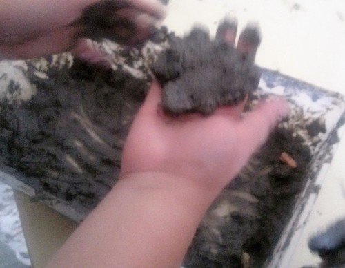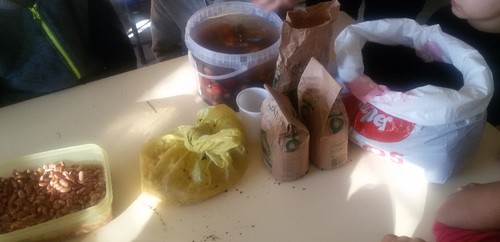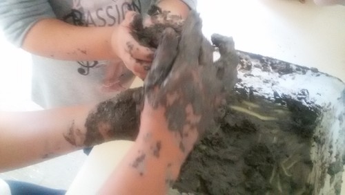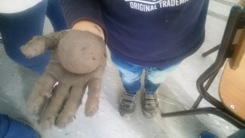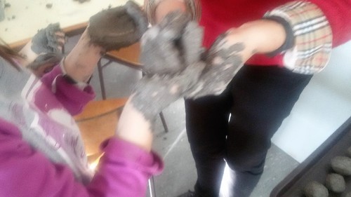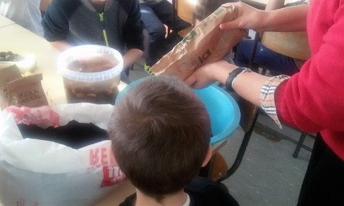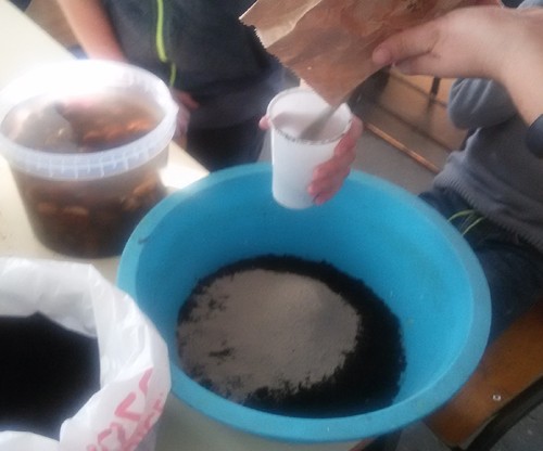 Algumas iniciativas já foram aqui divulgadas, nomeadamente a recolha de tampas, papel e cartão, óleos usados, rolhas de cortiça… Outra atividade será a reflorestação de áreas ardidas. Para isso, estivemos a fazer hoje granadas de sementes. As granadas consistem numa pasta de terra e argila em quantidades iguais, à qual é acrescentada água. Moldam-se pequenas bolas onde se introduzem sementes de espécies autóctones. No nosso caso, usamos bolotas e castanhas. Junto com estas, são colocadas sementes de leguminosas. As granadas, depois de moldadas e secas, serão lançadas na floresta.