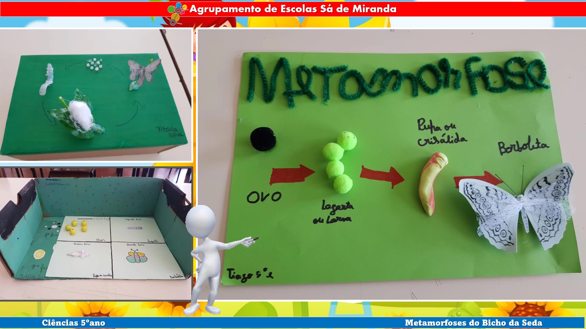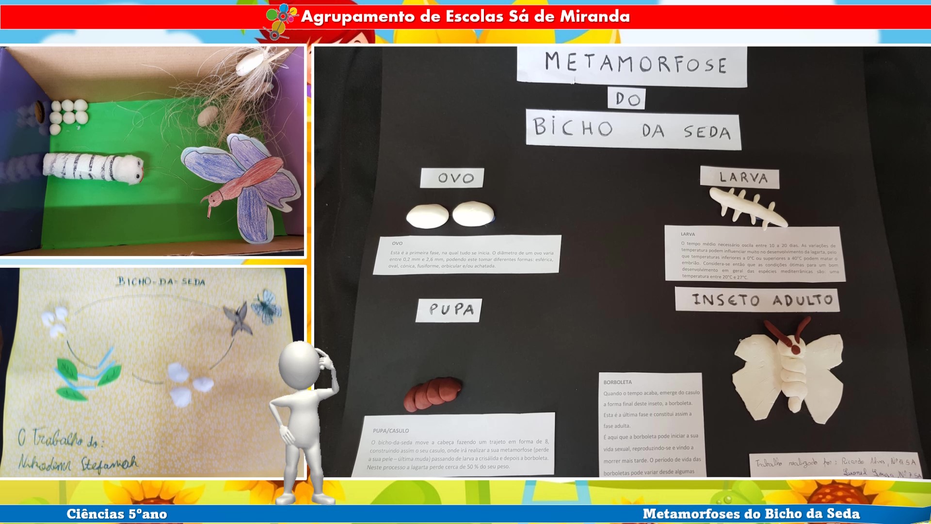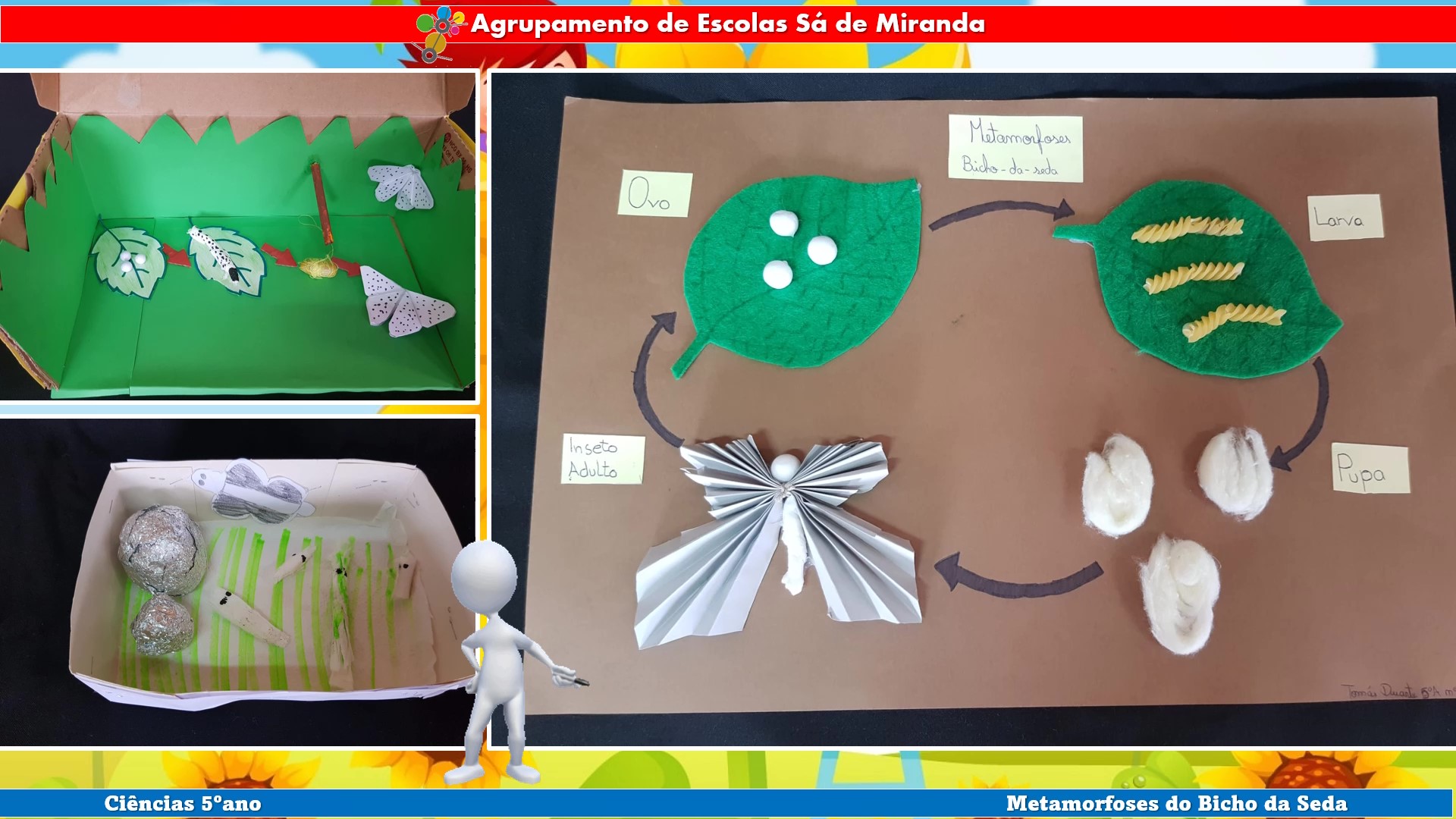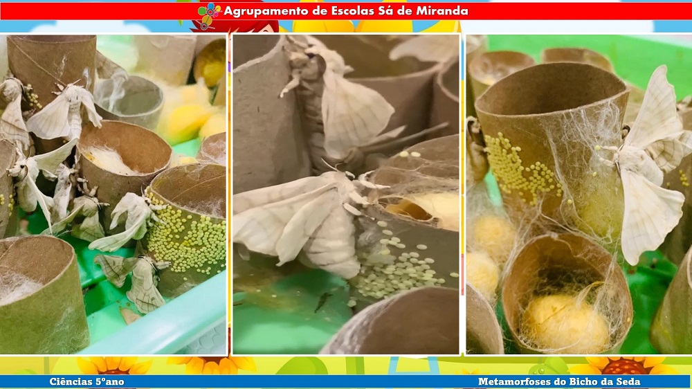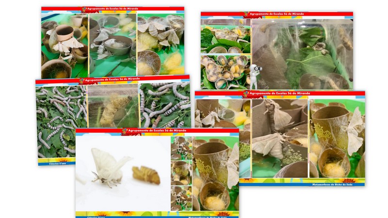 Nas aulas de ciências, aquando da abordagem do desenvolvimento indireto dos seres vivos, os alunos foram desafiados a acompanhar o progresso dos bichos-da-seda e a registar as suas diferentes fases, tanto em esquema como em maquete que pudesse ser mostrada à comunidade educativa.