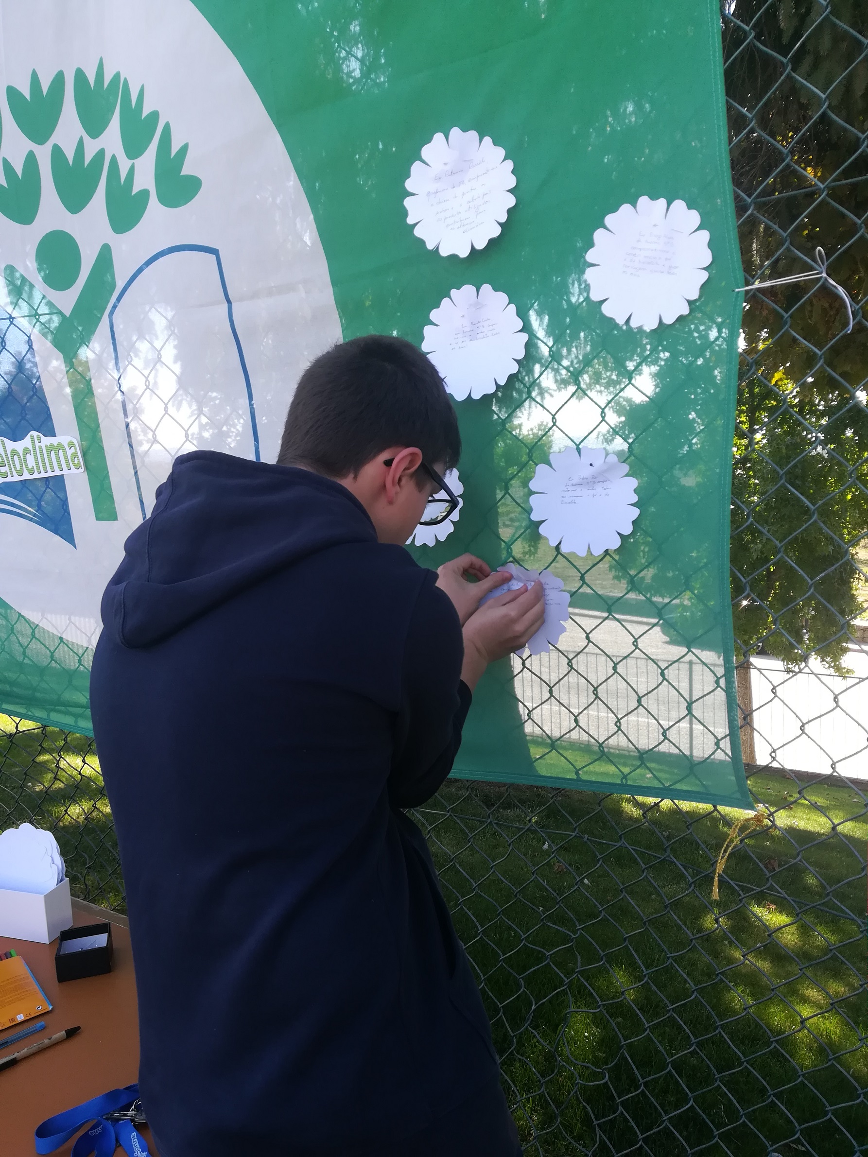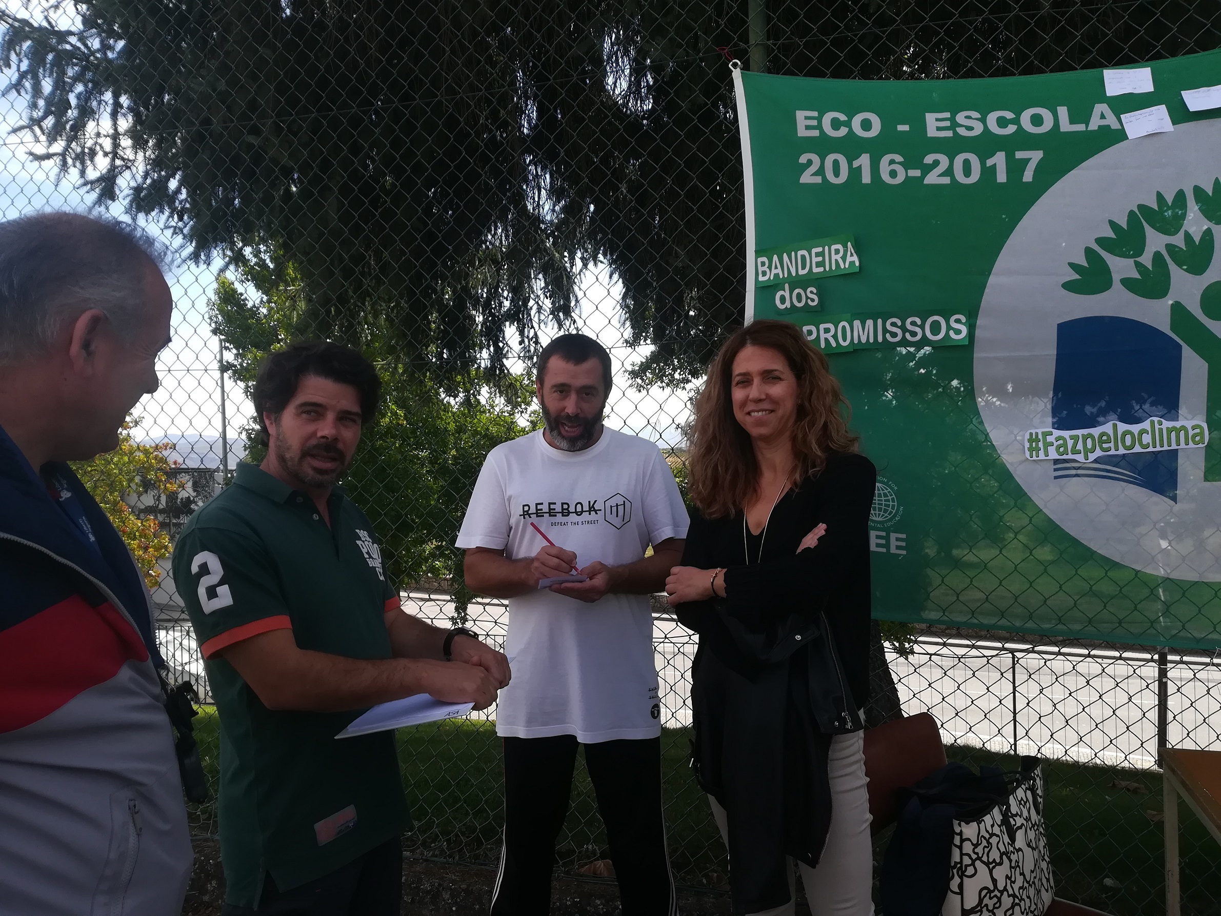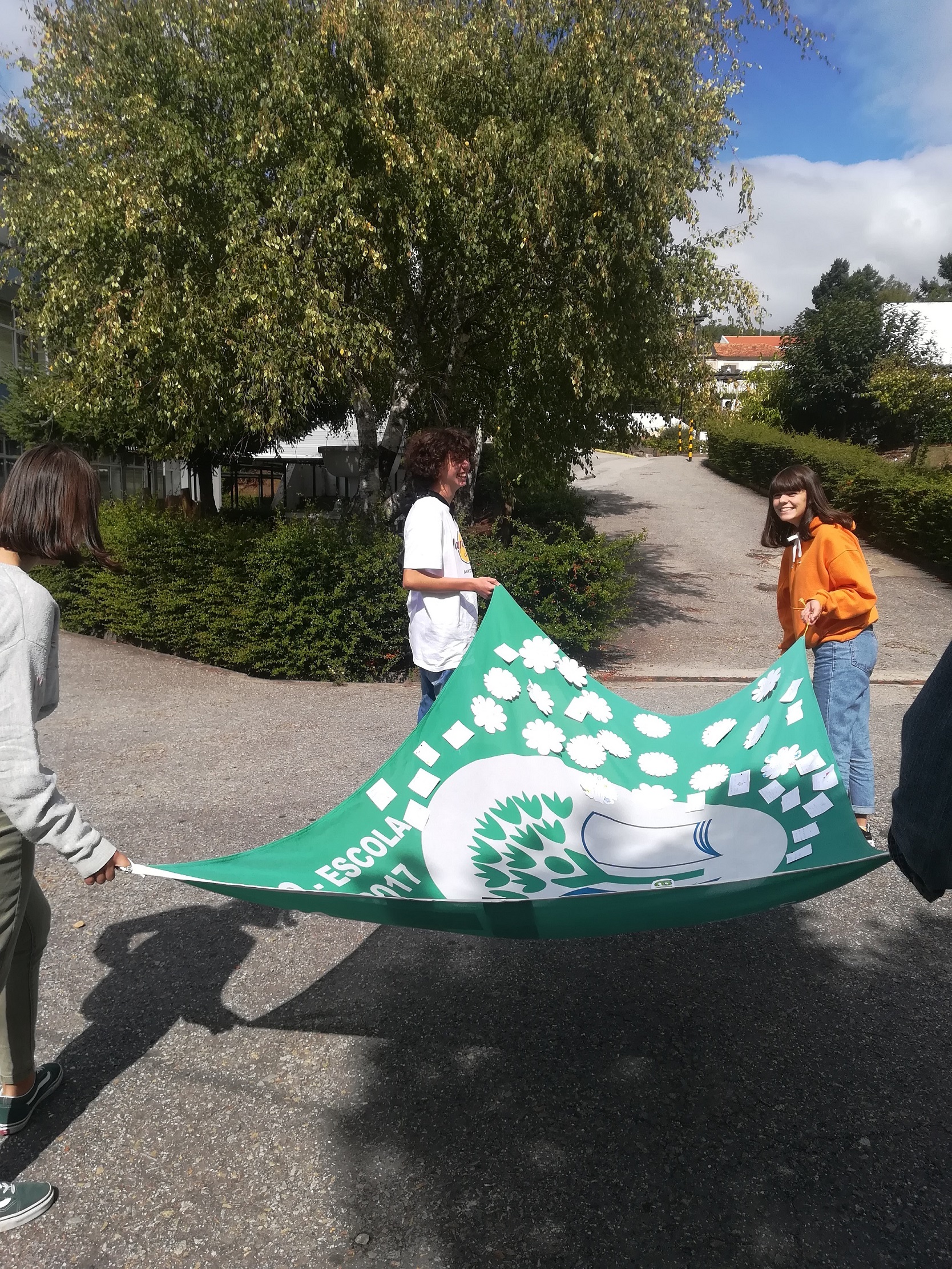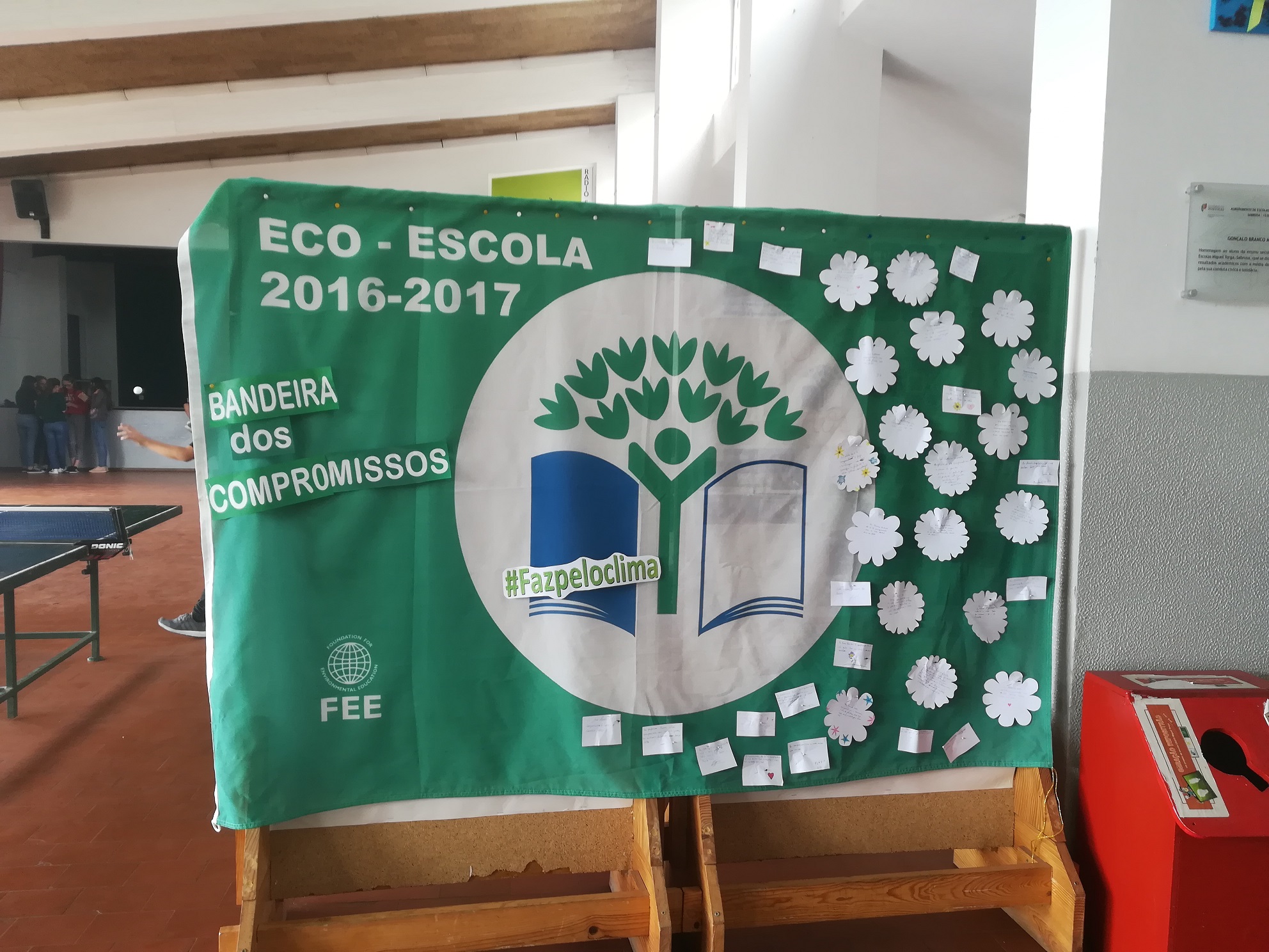 - Sensibilização da comunidade escolar com a atividade “Bandeira dos Compromissos” em que todos os elementos da comunidade educativa foram convidados a deixar o seu compromisso sobre o que podem e querem “fazer pelo clima”, devidamente identificado, afixado numa bandeira Eco-Escolas. A bandeira esteve no campo de jogos das 11h00 às 13h00 e na sala de convívio, no mural Eco-Escolas, durante a tarde, onde se manteve até ao dia 30 de setembro.