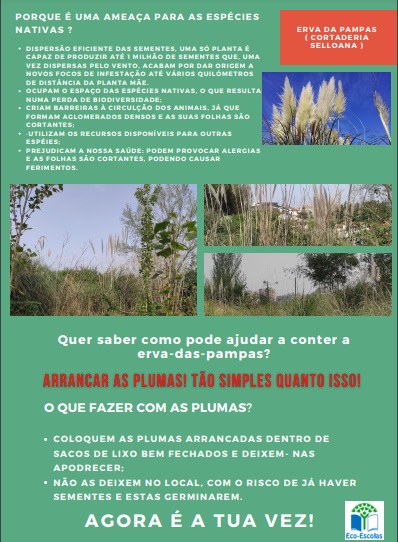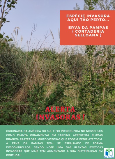 No sentido de alertar para o perigo das plantas invasoras em geral e em particular a planta exótica invasora- Erva das Pampas (Cortaderia selloana), pronta a germinar em qualquer altura, em especial após os incêndios foi proposto, a grupos de alunos das turmas de 8ºano, a elaboração de trabalhos escritos sobre esta temática. Um dos grupos elaborou um poster e um flyer para o concurso “Alerta Invasoras” os quais alertam para o facto desta invasora estar-se a expandir-se demasiado rápido em Portugal, fazem referência às razões que levam a considerá-la uma ameaça para as espécies nativas e como as podemos eliminar. Realço que as fotografias usadas no Poster e no flyer foram tiradas pelos alunos em Braga.