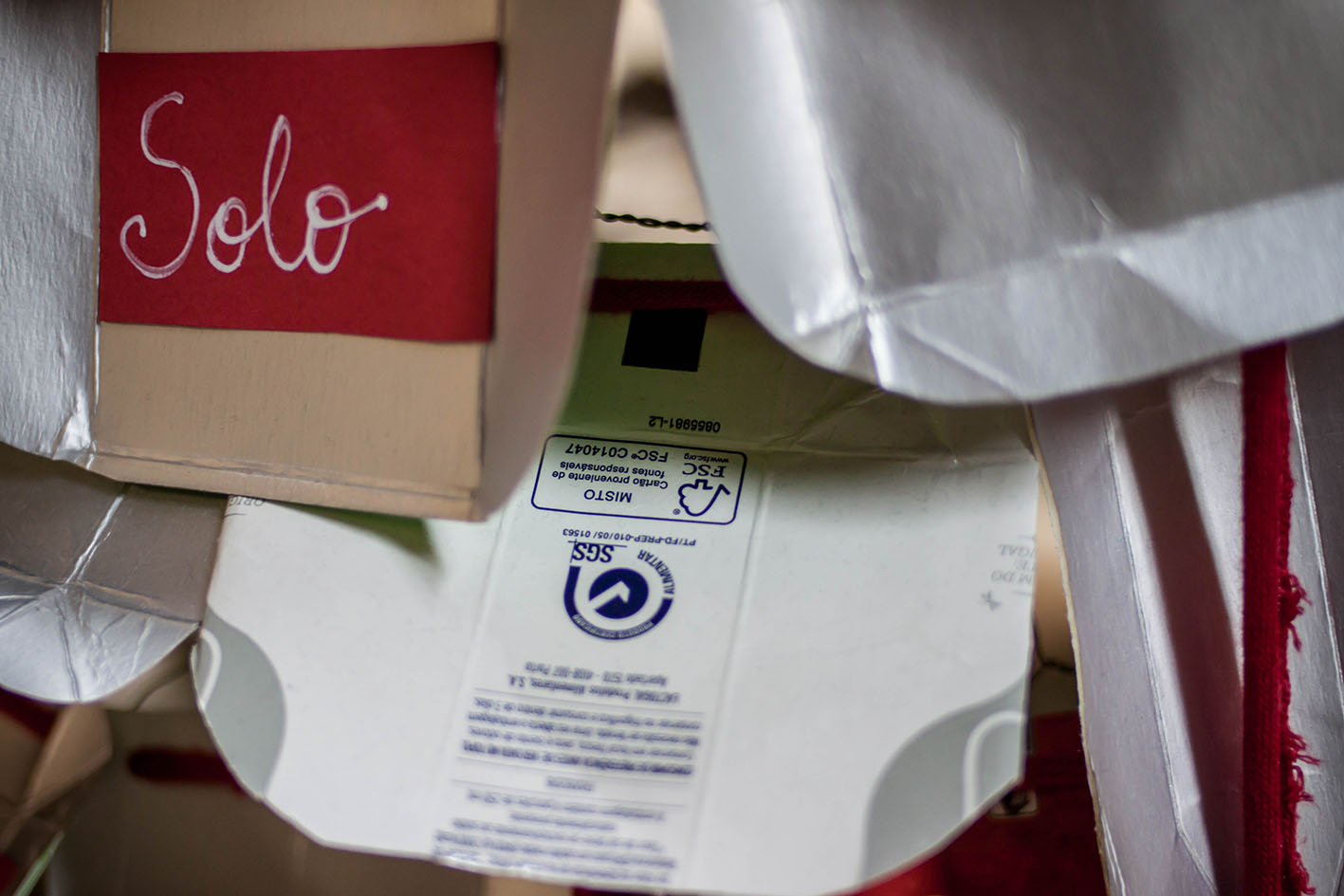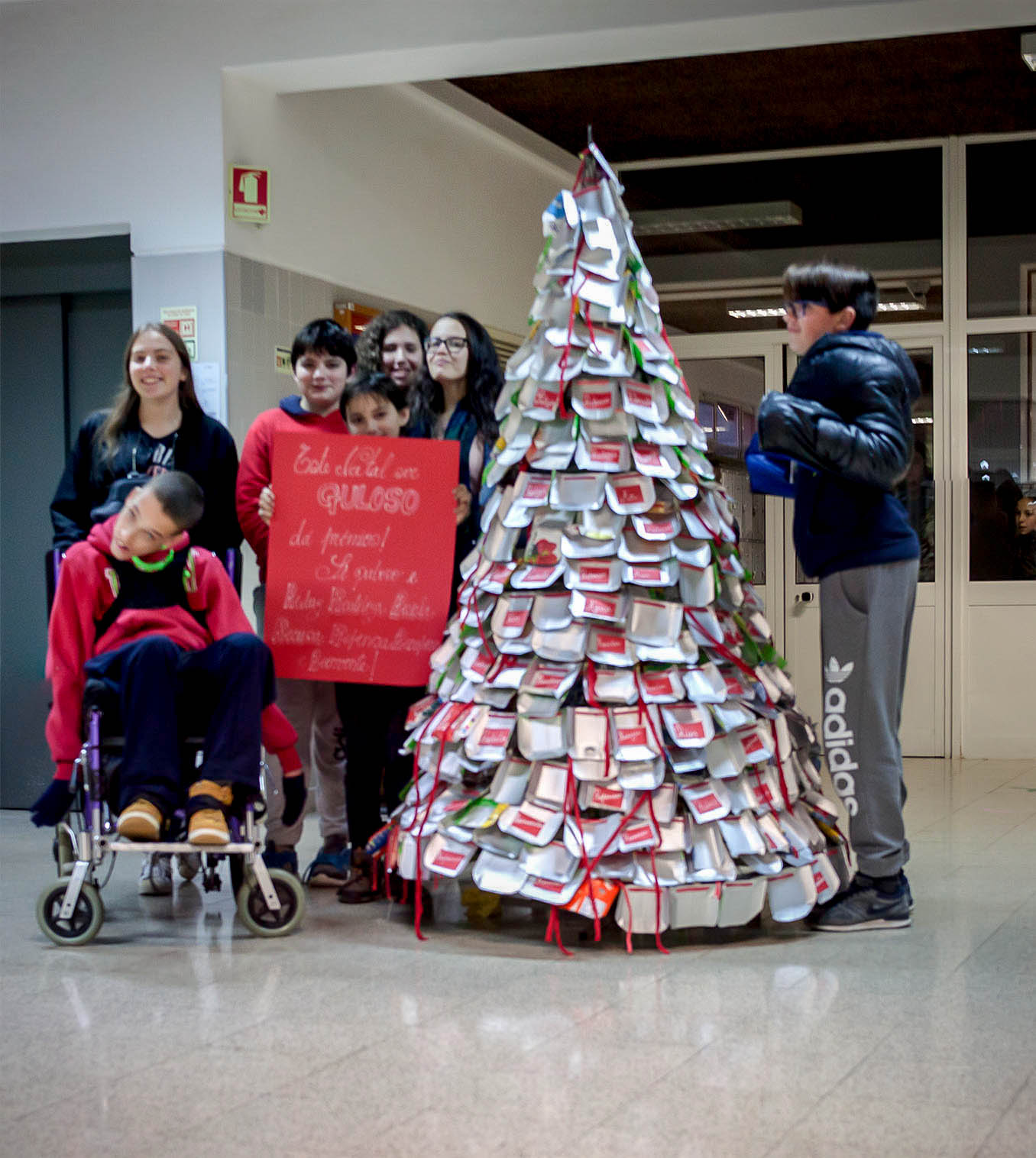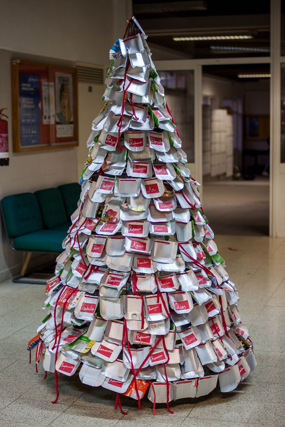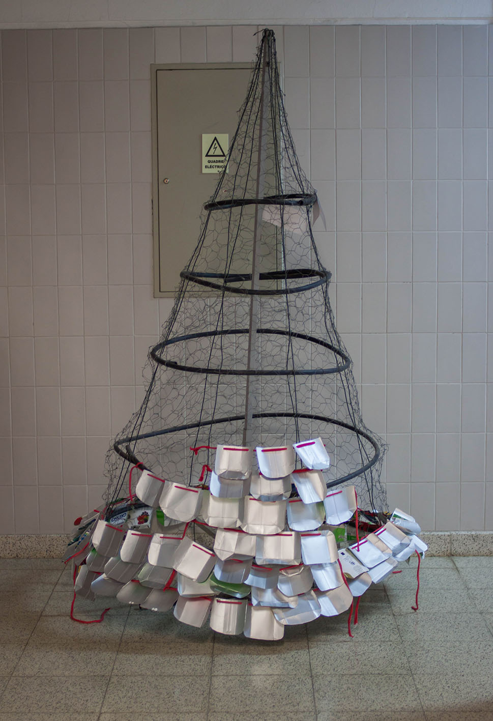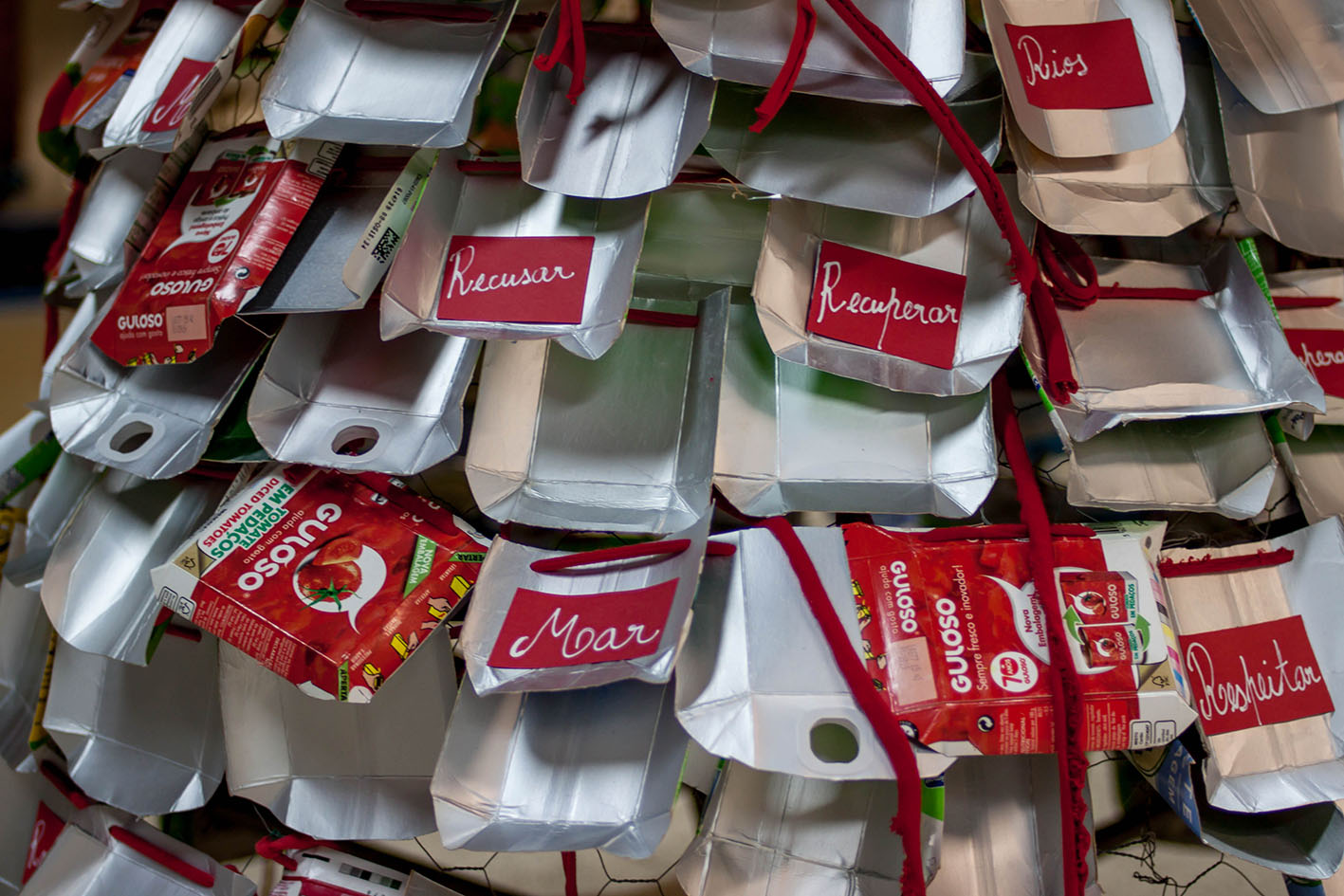 [1] Privilegiou-se a utilização das embalagens TETRAPACK utilizando o interior prateado para o revestimento exterior da árvore o que, pela sua uniformização, destaca (pela cor) as embalagens obrigatórias da GULOSO_tomate. O fio vermelho usado para suportar as grinaldas, faz referência à simbologia da cor no Natal.