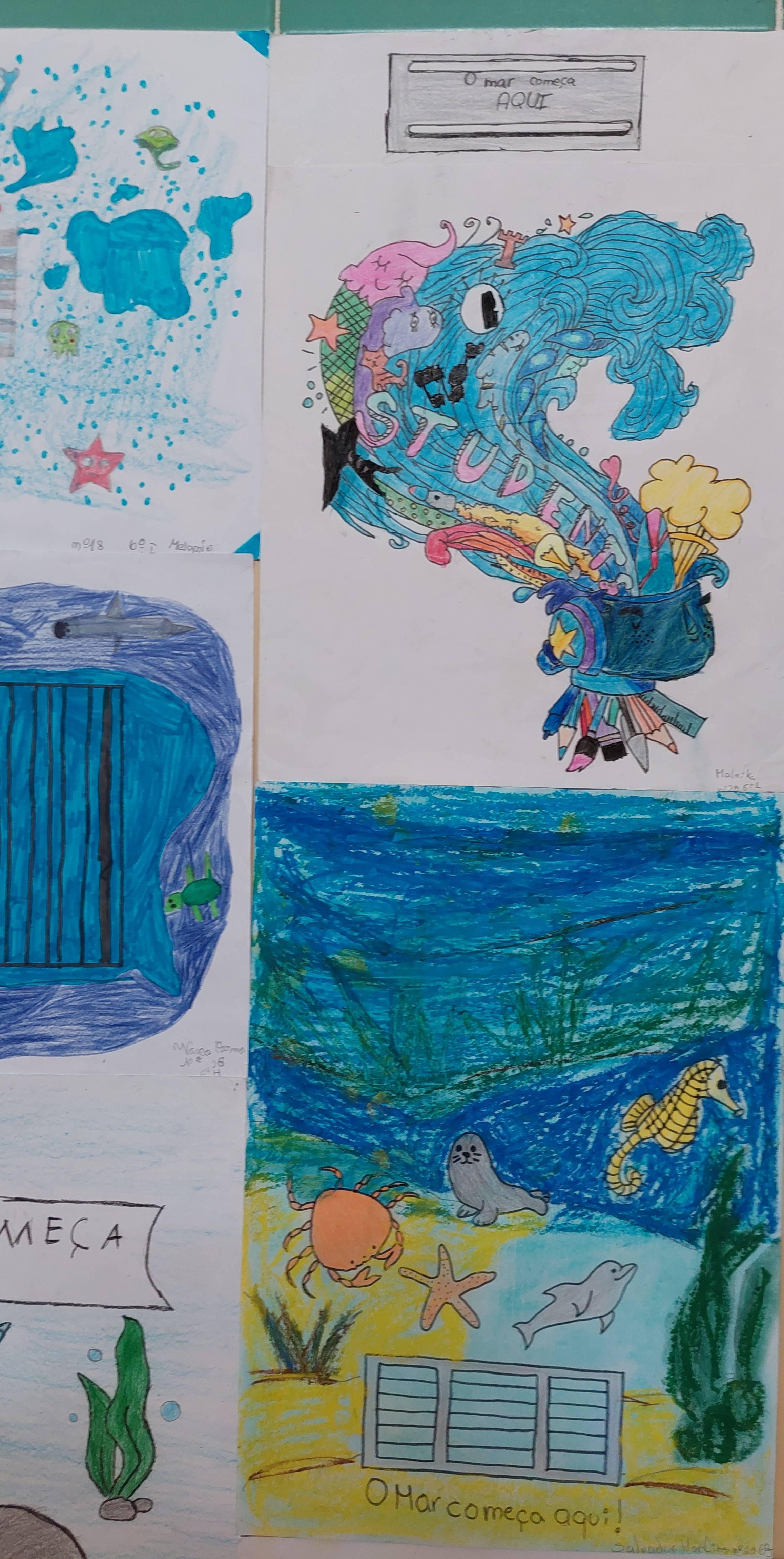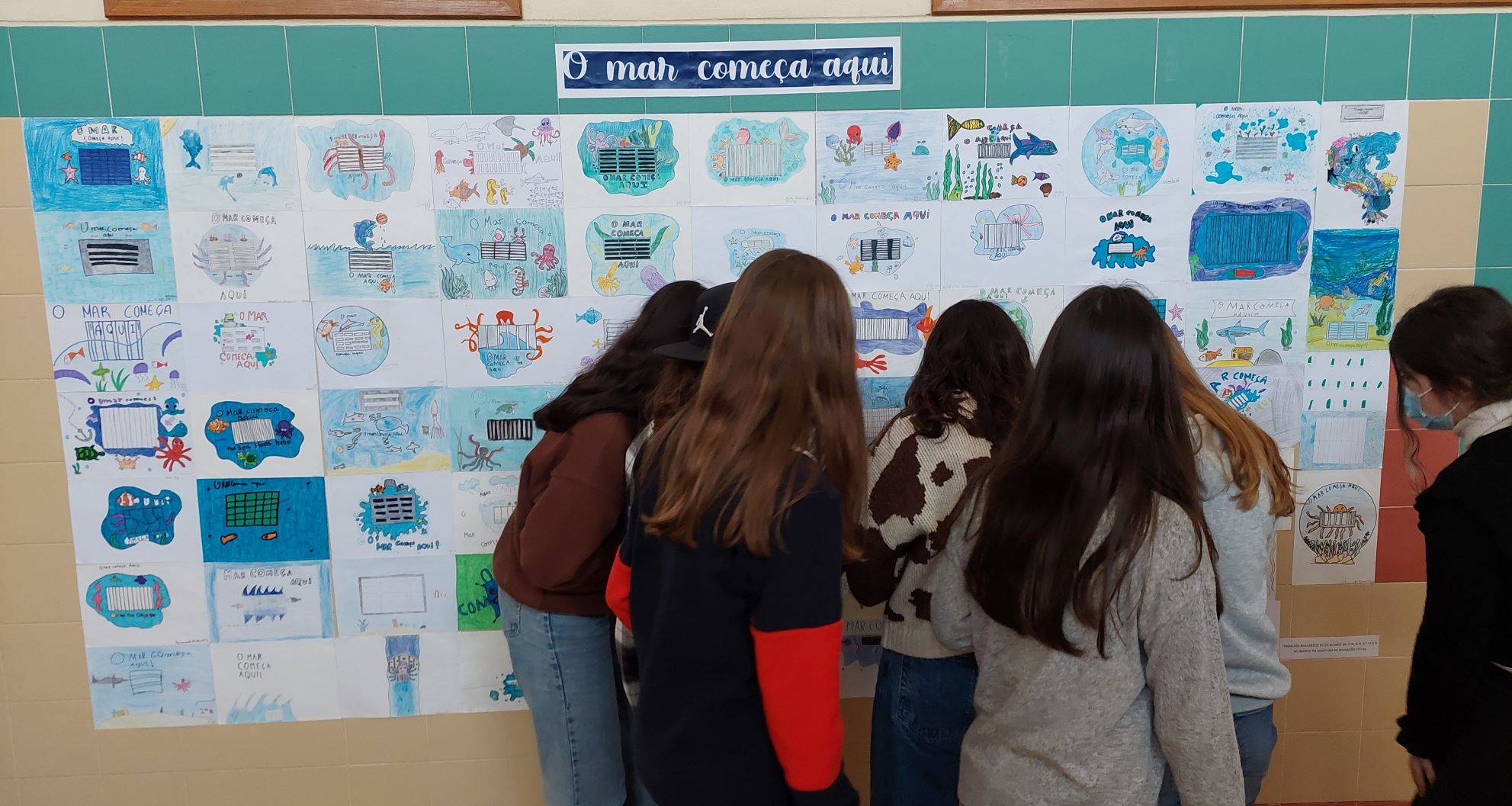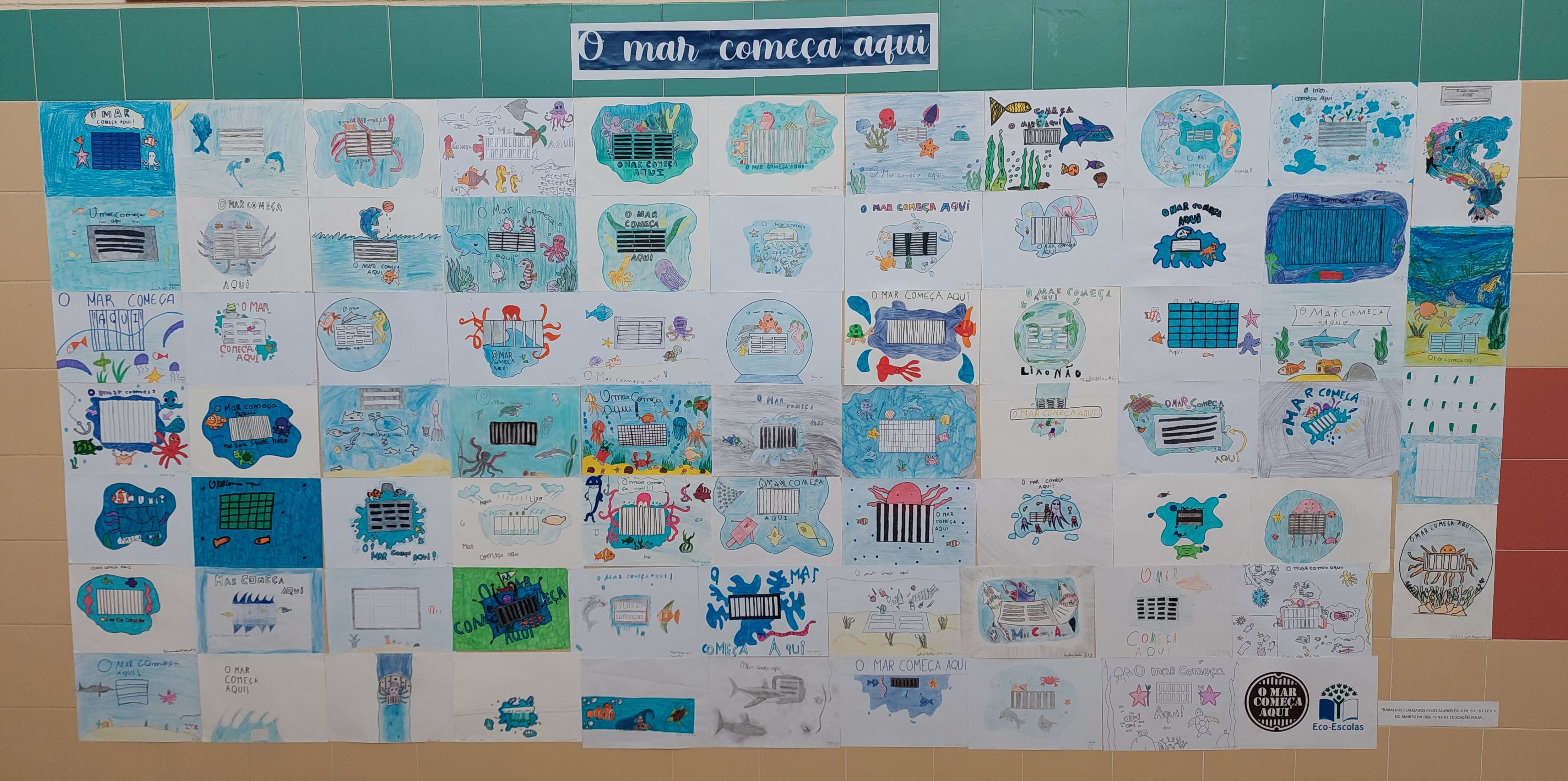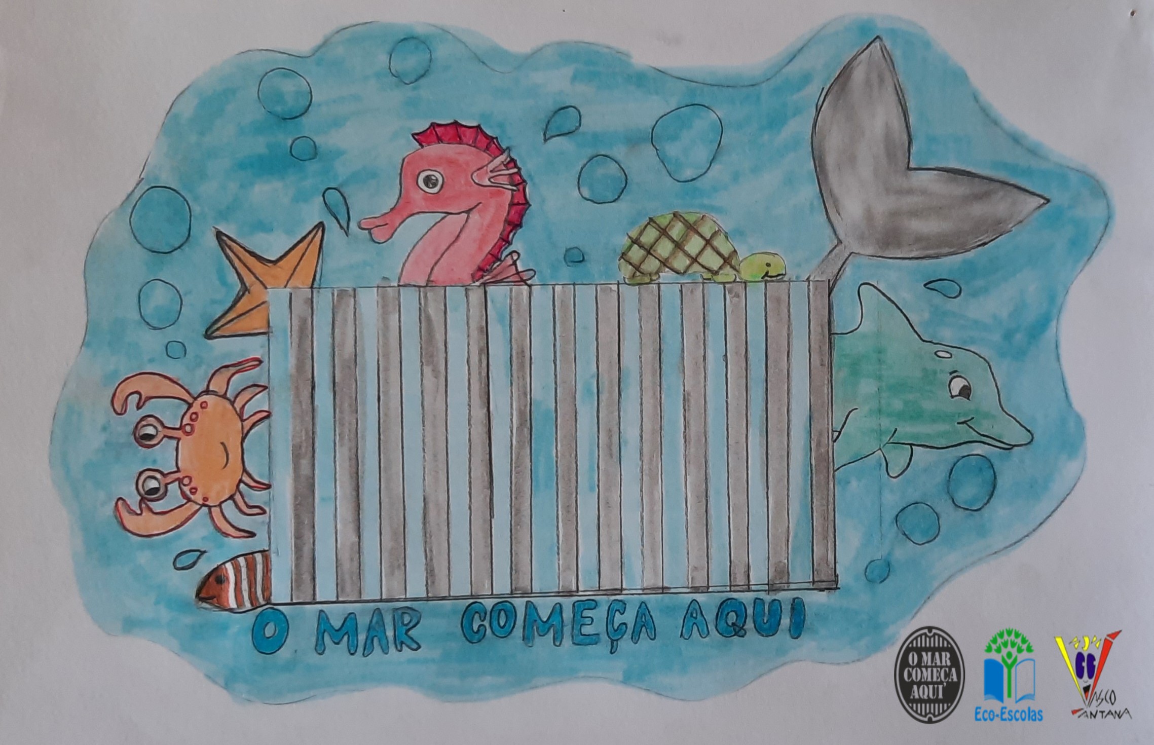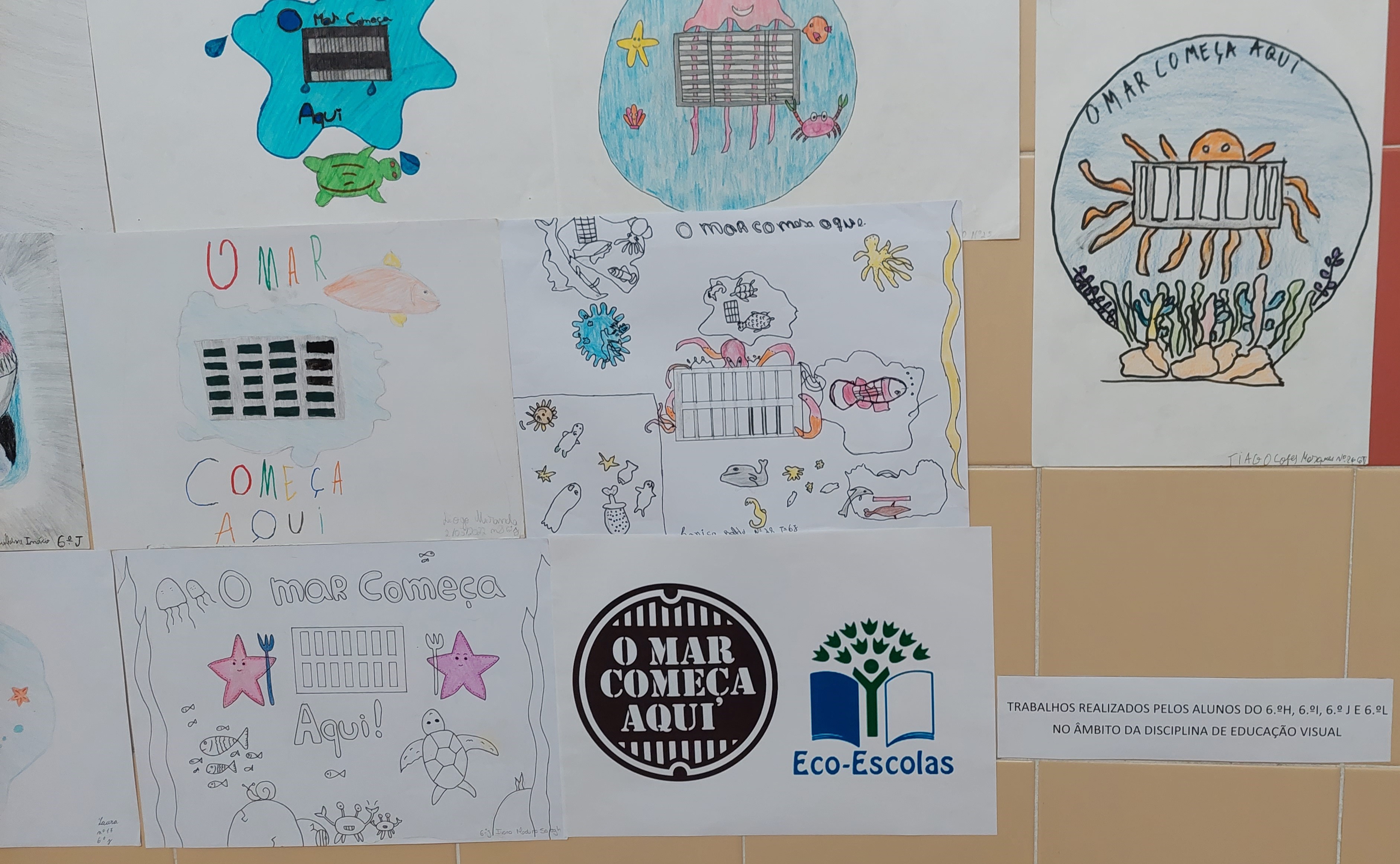 Após ter sido lançado o desafio “O Mar Começa Aqui” pela equipa Eco-Escolas, os alunos do 6.º ano da Escola Básica Vasco Santana deram início ao projeto, sob a orientação da docente de Educação Visual, Paula Serrano, demostrando entusiasmo. Na primeira fase do projeto, os alunos foram sensibilizados para a importância das sarjetas e sumidouros no passeio, enquanto importantes dispositivos dos fluxos de água, e para a problemática relacionada com a incorreta deposição dos resíduos e a consequente contaminação das linhas de água. Com vista à sensibilização da comunidade escolar para esta problemática, que reforça que “tudo o que cai no chão, vai parar ao mar”, os alunos deram asas à imaginação e criatividade, e realizaram com dedicação desenhos originais. Numa segunda fase, que decorreu nos últimos dias, foram submetidos 73 desenhos, que fazem parte integrante de uma exposição sob o título “O Mar começa aqui”. Paralelamente, procedeu-se à votação, através de uma apresentação em Google Slides, que compilava os desenhos a concurso seguido de um questionário realizado no Google Forms, através do link a partir do qual a comunidade educativa poderia votar. Apurou-se assim o desenho que recolheu mais votos, cuja autora foi a aluna Joana Teixeira. Este retrata o ecossistema marítimo ameaçado pela poluição de qualquer tipo de resíduos, entre eles, os provenientes das sarjetas. Esta imagem apresenta em redor da sarjeta diferentes espécies, tais como peixe-palhaço, caranguejo, estrela-do-mar, cavalo-marinho, tartaruga-marinha-comum, baleia e golfinho, em volta de uma mancha azul representativa do mar a transbordar pelo passeio. Hoje, Dia Mundial da Terra, a exposição teve ainda mais “visitantes”. O dia chuvoso e cinzento, fez com que os alunos não se deslocassem tanto para o exterior, permitindo uma contemplação mais atenta!