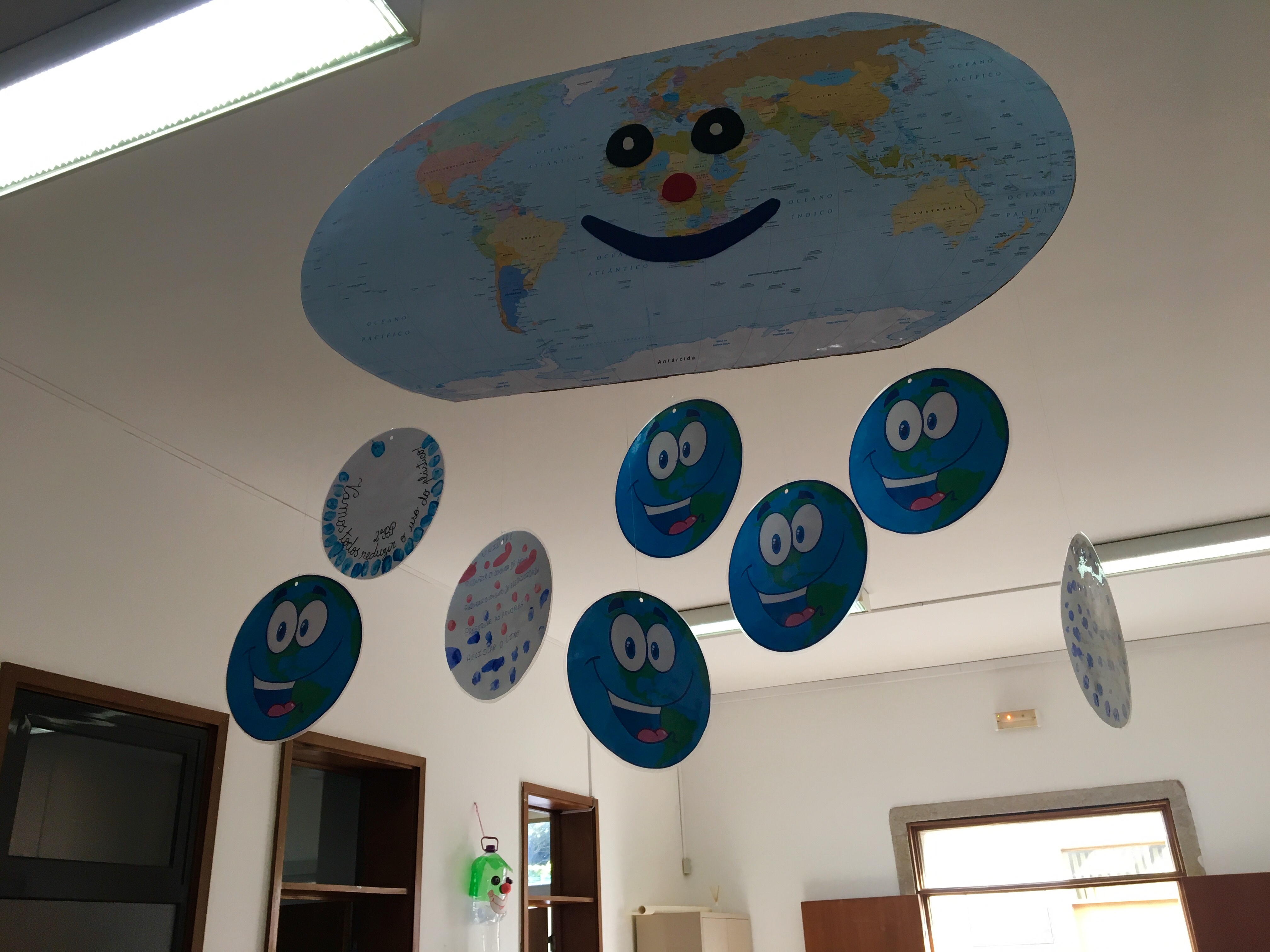 Todos os planetas resultantes das sete turmas e centro de apoio à aprendizagem elaboram um Mobile dos Compromissos, #fazpeloclima, reutilizando mapas antigos.