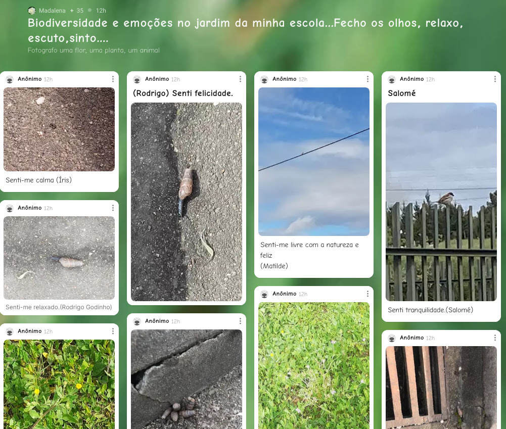 Durante a aula de Ciências Naturais os alunos de duas turmas do 8º ano fazem uma aula de campo. Passeiam pelo jardim da escola, escolhem um recanto do jardim e são convidados a fechar os olhos e a ouvir a natureza….de seguida os alunos fotografam um ser vivo do jardim e referem as suas emoções. As suas recolhas e emoções são colocadas num padlet.