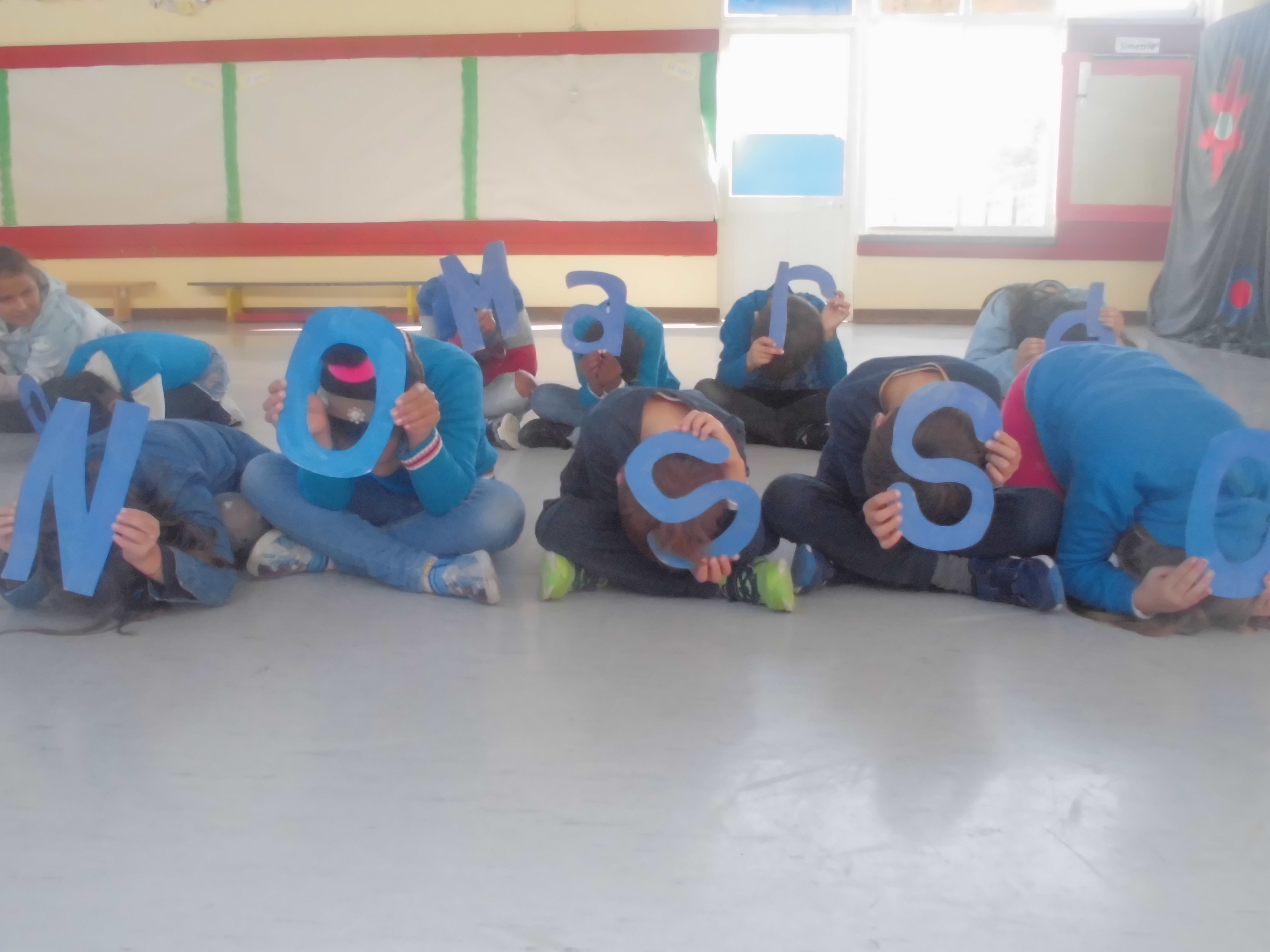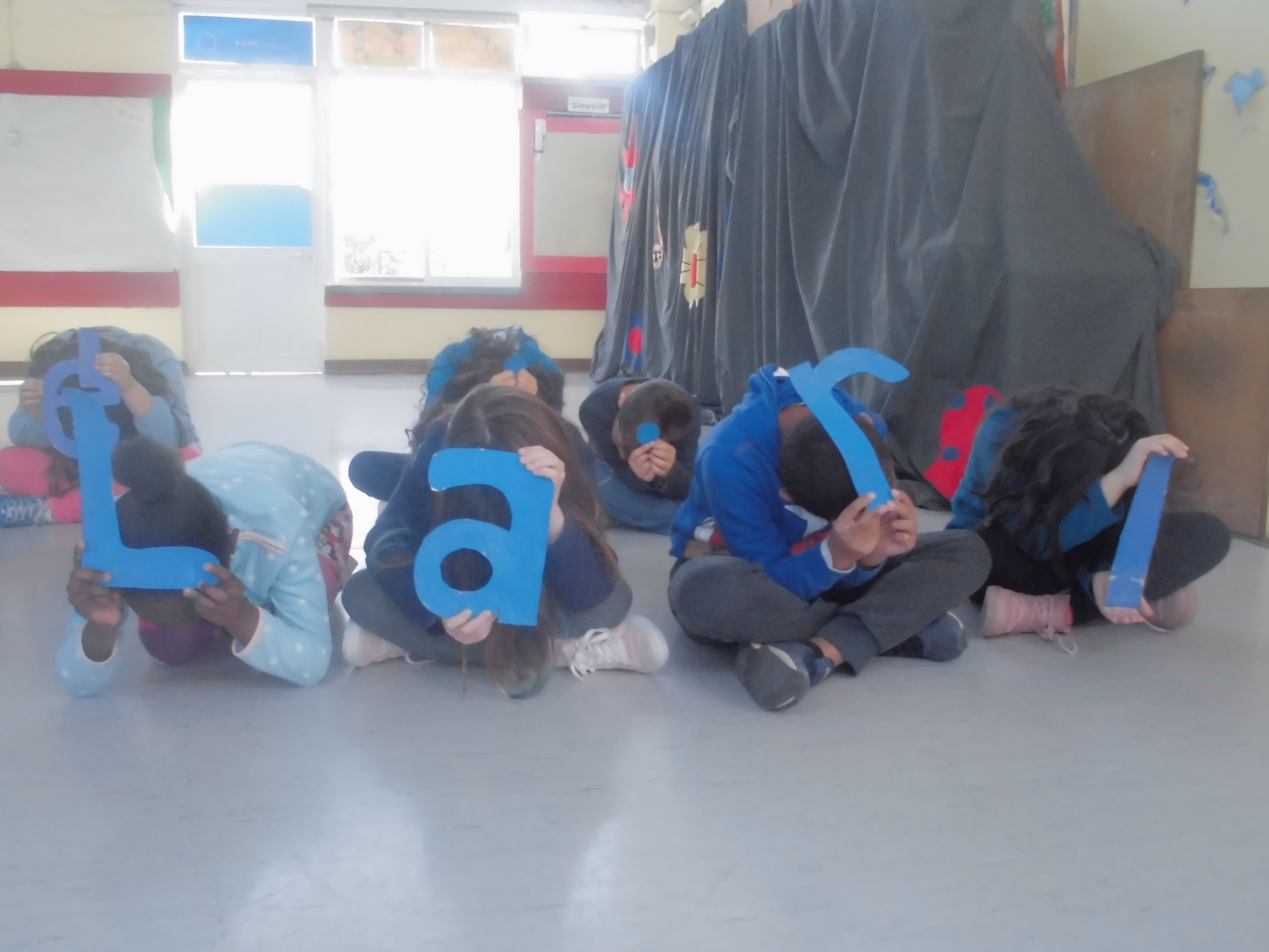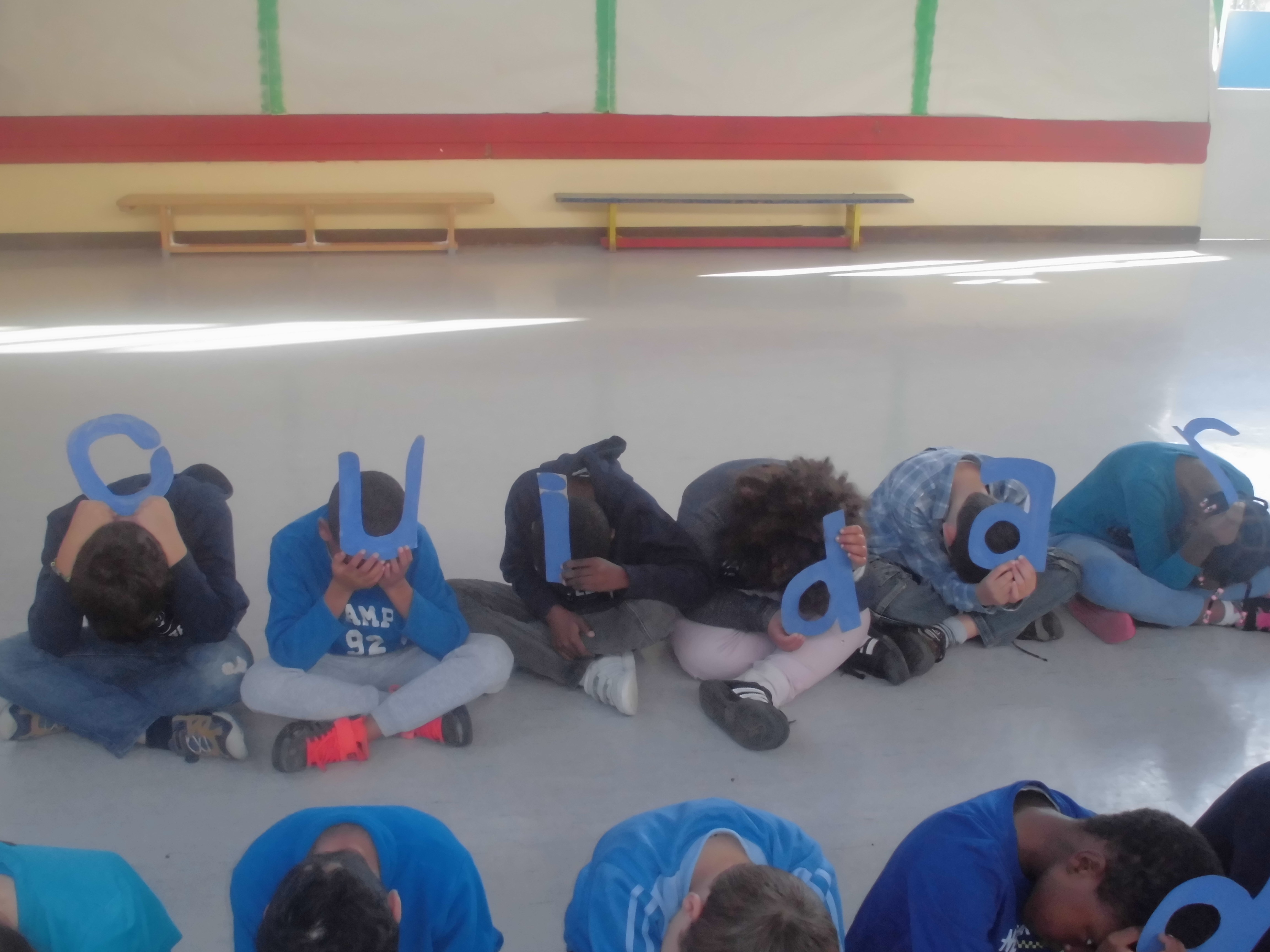 Cada aluno em posição de “conchinha” mostrava uma letra ou sinal de pontuação de “Cuidar do Mar é… cuidar do nosso Lar!”.