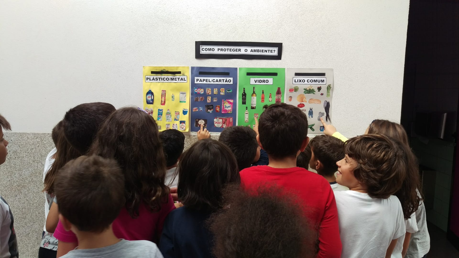 Realizaram-se jogos de separação dos diferentes resíduos produzidos em sala de aula. Os alunos fizeram um pequeno compromisso ambiental (ex: separar papel, separar plástico, pôr pilhas no pilhão,….)