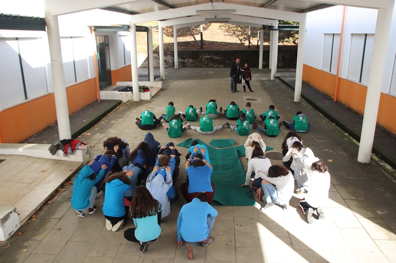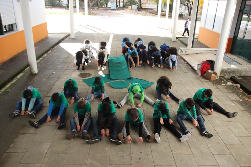 Posteriormente, os alunos dos 7ºs e 8ºs anos, desenharam, com os seus corpos, o símbolo do Eco-Escolas. Esta atividade foi fotografada e as respetivas fotos servirão para a notícia do jornal e para divulgar a atividade na página do agrupamento e no Placard do eco-Escolas.
