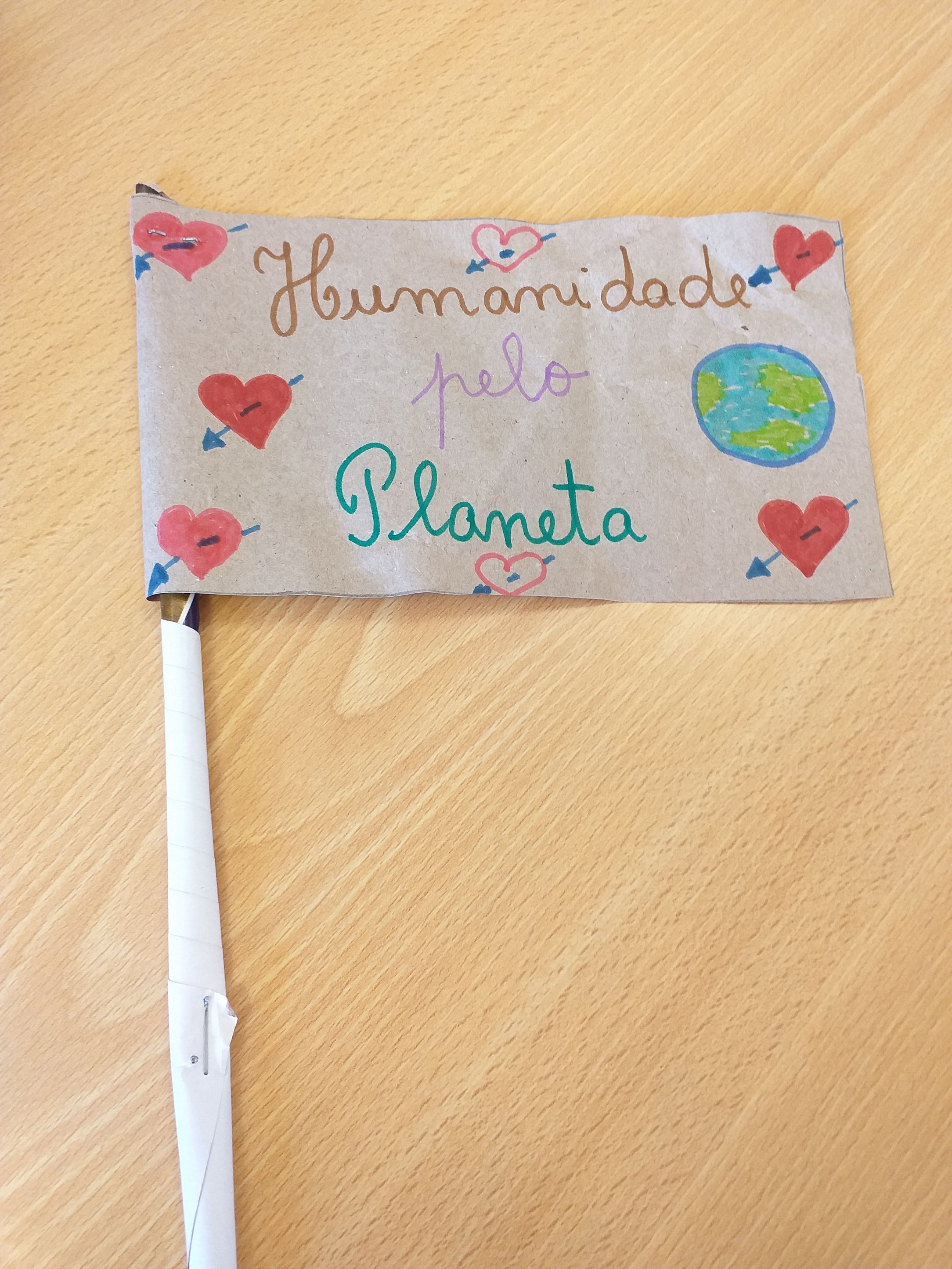 Os alunos observaram um vídeo sobre as Alterações Climáticas no nosso Planeta e, de seguida, verificaram quais as causas e os efeitos destas alterações. Chegaram à conclusão de que é necessário haver menos consumo e utilizarmos as energias renováveis. Realizaram pequenas bandeiras de materiais reaproveitados com a mensagem “Humanidade pelo Planeta!” que levaram depois para as suas casas. Colocamos a bandeira verde a meia haste e pintamos todos a cara de amarelo (professores, funcionários e alunos).