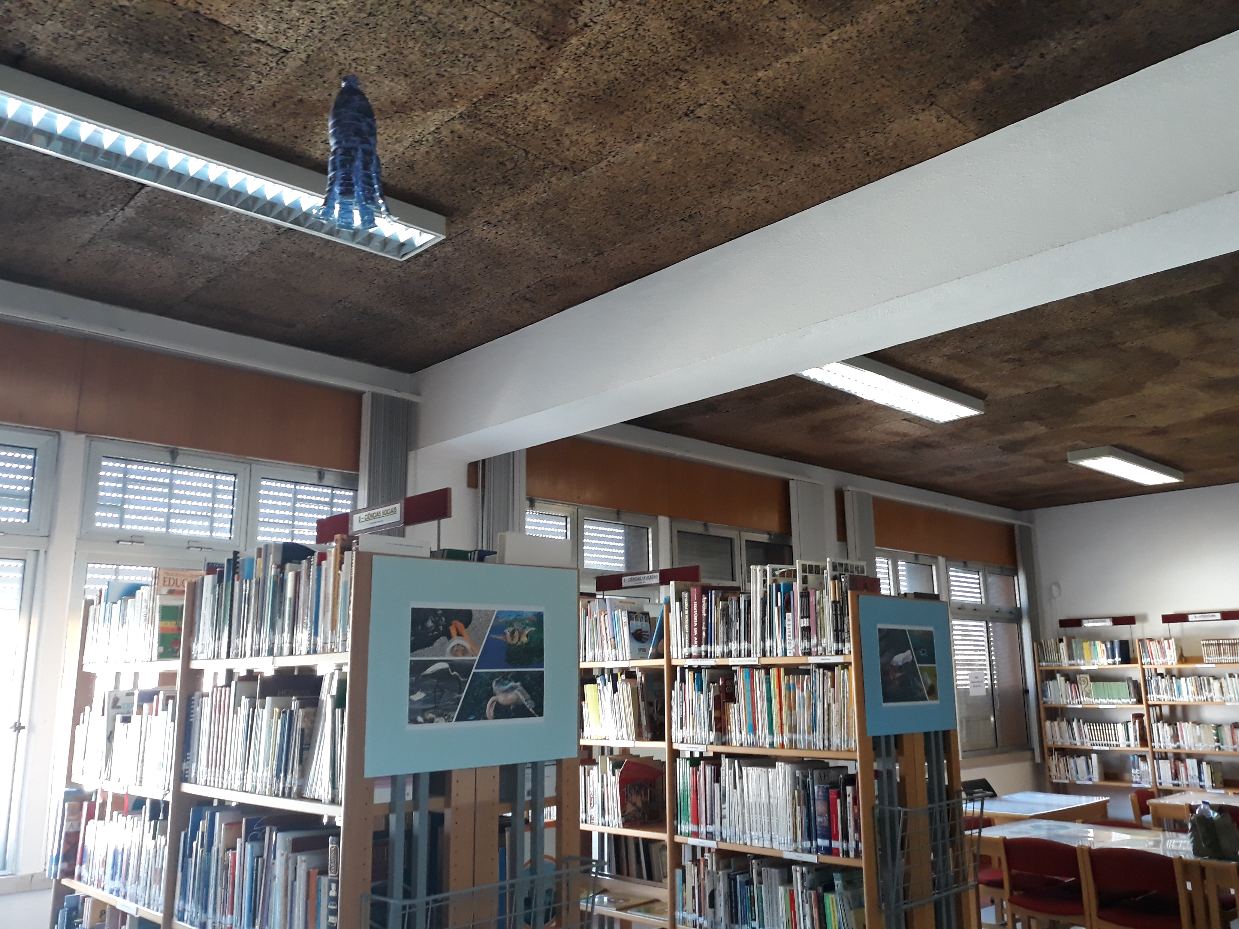 Exposição de animais marinhos elaborados com plástico e de exemplos de lixo, acompanhados com imagens verídicas sobre animais e plantas (ecossistemas) afetados por estes materiais.