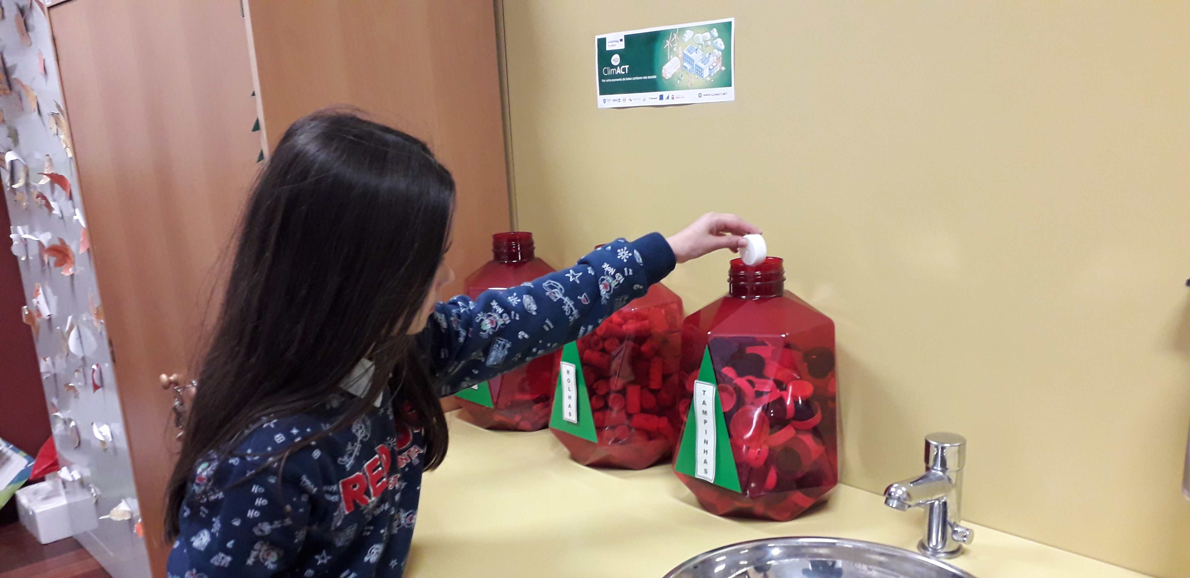 Ao longo do ano letivo, a comunidade escolar recolhe tampinhas, rolhas e pilhas. Nas diferentes salas de aula, foram criados mini ecopontos onde são colocados estes resíduos. Posteriormente, são entregues em centros de recolha.