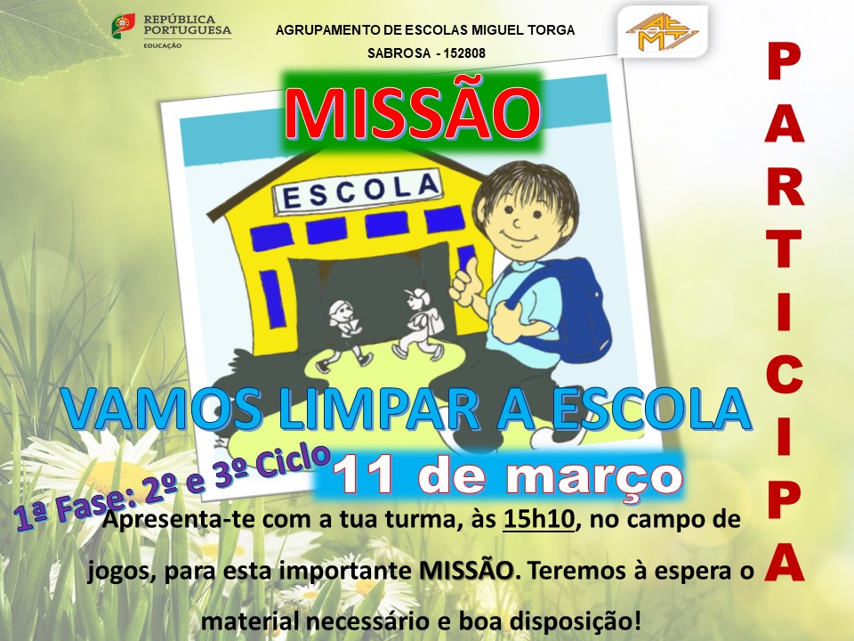 Concretizou-se, na tarde do dia 11 de abril, a 1ª fase da Missão “Vamos Limpar a Escola”. Esta atividade foi dinamizada no âmbito do Plano de Ação do Eco-Escolas, que pretende promover ações no âmbito da Educação Ambiental para a Sustentabilidade, desafiar os discentes a tomarem consciência da importância do ambiente no dia a dia da sua vida pessoal, familiar e comunitária e encorajar todas as crianças e jovens, nas suas atividades escolares, a desenvolver e a pôr em prática, entre outros, valores de cidadania e participação na âmbito da Educação Ambiental para a Sustentabilidade.