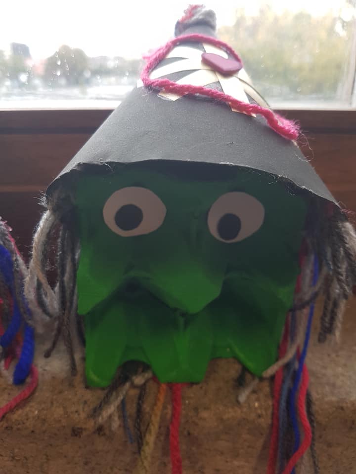 Para assinalar o Dia das Bruxas, os alunos do 2.º C realizaram monstros e bruxinhas. Para esta atividade, reutilizaram materiais, como: cartão, rolos do papel higiénico, caixas de ovos, caricas, tampinhas, cápsulas de café, rolhas, palhinhas, resíduos de lã e de cartolina, etc.