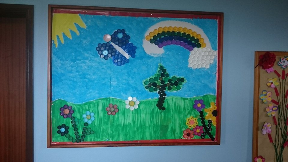 Construção de um mural com tampinhas onde foram elaborados elementos relacionados com a floresta. Neste mural foram utilizadas as tampinhas de plástico, tintas, cola e cartão.