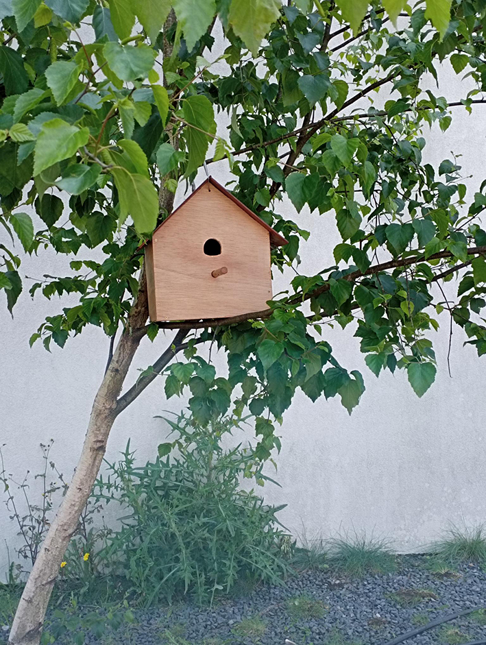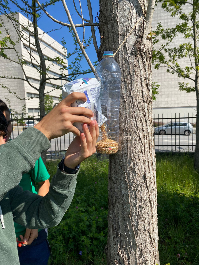 Os alunos construíram com materiais recicláveis comedouros/ninhos para aves e penduraram-nos em ramos de árvores da escola, tendo previamente colocado vários tipos de sementes.
