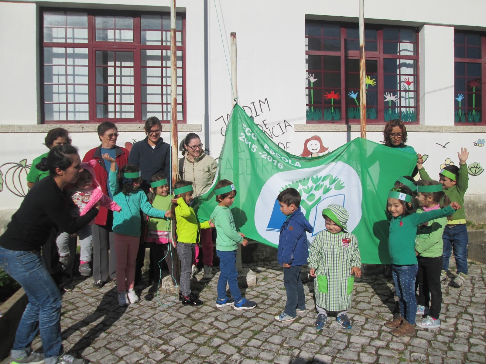 A cerimónia do hastear da bandeira Eco-escolas contou com a presença do Presidente Junta de Freguesia das Alhadas, pais e avós. O evento foi divulgado através da Comunicação Social “Diário de Coimbra”. As crianças e adultos assumiram o compromisso de cuidar do ambiente, cumprindo as regras do eco código, compromisso selado num painel afixado em local comum de fácil acesso a todos os utentes. As famílias foram envolvidas na recolha de pilhas junto de entidades da sua área de influência e numa campanha com objectivos solidários.