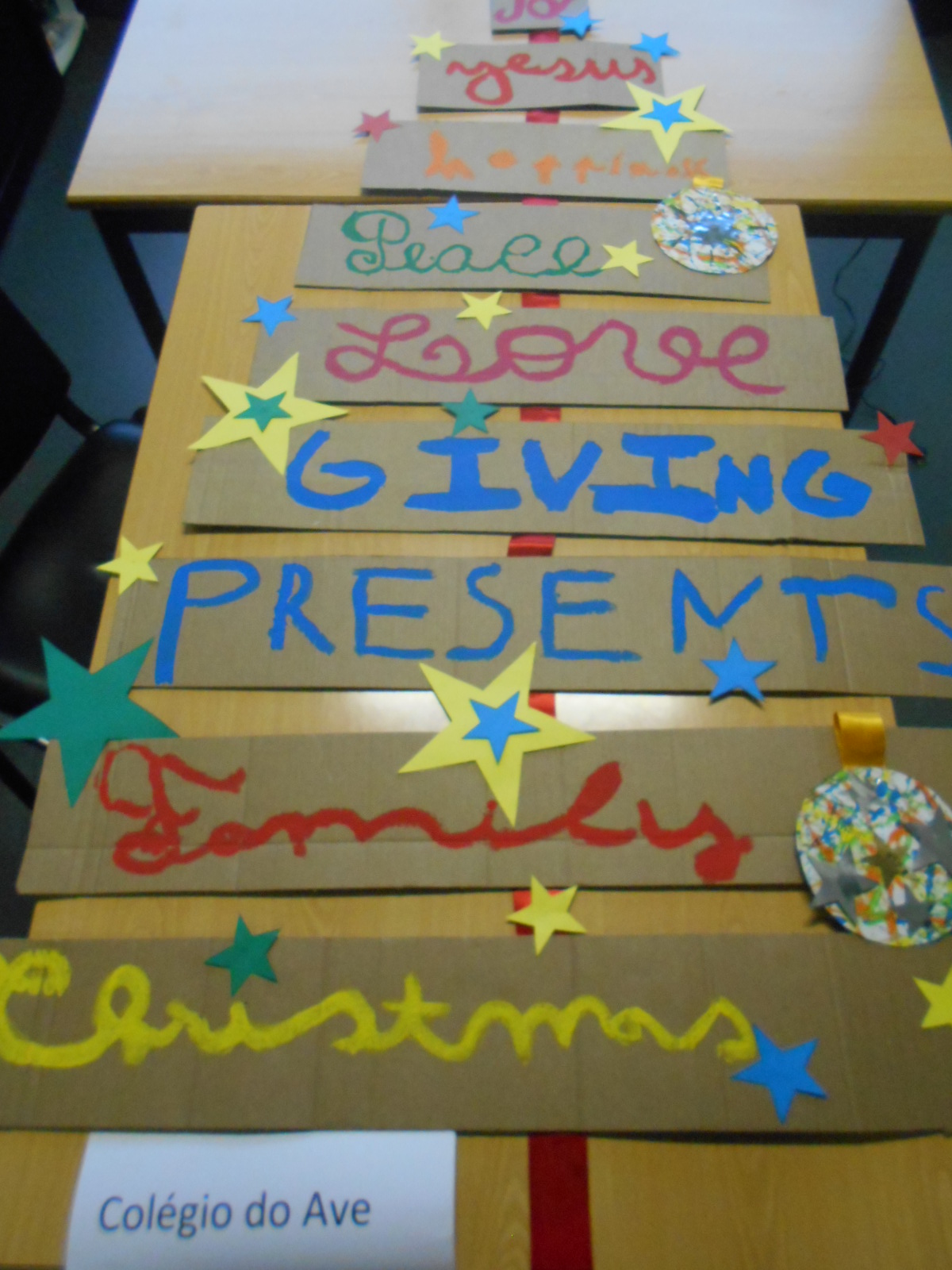 Os alunos do Clube de Inglês responderam ao desafio lançado pelo PEGADAS e construíram uma árvore de Natal com base na reciclagem de cartão onde, em inglês, escreveram os seus desejos de Natal para a comunidade educativa.